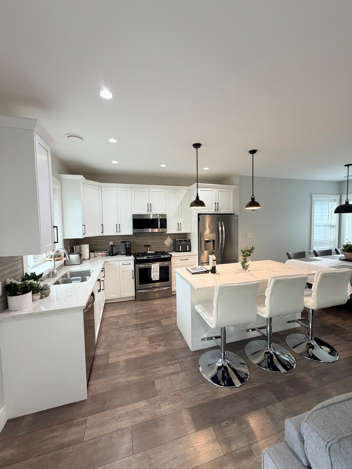 Amplia y elegante suite al final de un tranquilo callejón sin salida junto a un pequeño bosque. Combinación de salón/comedor con rincón de cocina con nevera, cafetera Keurig, microondas, hervidor de agua, tostadora y enfriador de agua. Relájate en el gran y cómodo sofá y en el sofá de dos plazas con una gran televisión de 55 pulgadas. El dormitorio ofrece una cómoda cama tamaño queen y un escritorio. El baño tiene una combinación de bañera y ducha. Se proporcionan toallas, jabón y champú. Te invitamos a compartir nuestro pequeño oasis en el patio trasero y nuestra chimenea de gas.