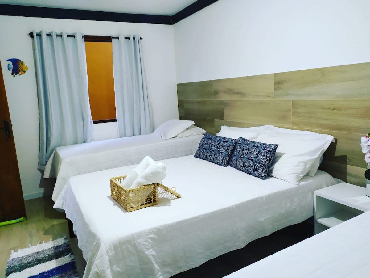 A suite comporta até 6 pessoas, valor do anúncio é para até 4 pessoas, em caso de reserva para 5 ou 6 pessoas favor enviar mensagem. Suite com ar condicionado, banheiro com 2 chuveiros. Roupa de cama de banho e café da manhã personalizado. Somos uma hospedaria hostfamily no centro da vila de Itaúnas