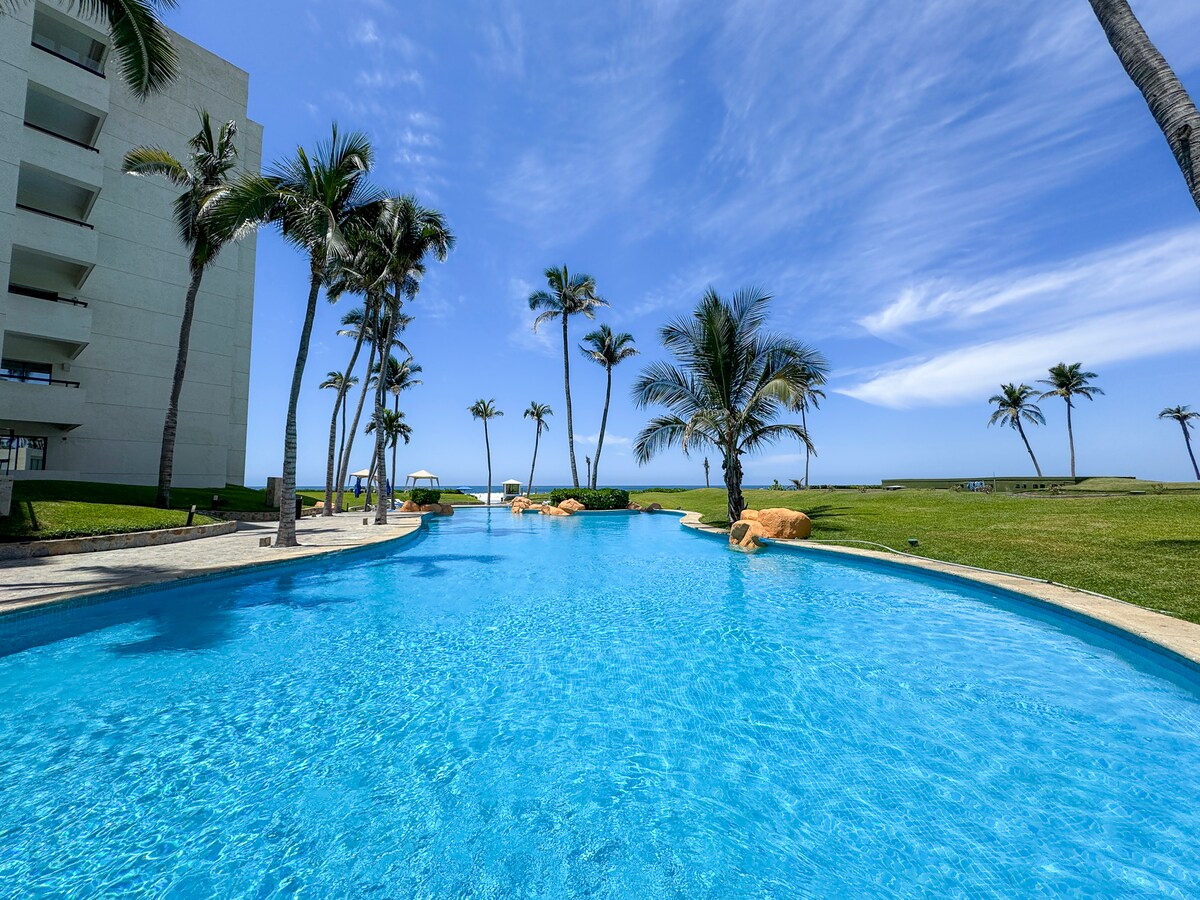 Lujoso, moderno y amplio departamento al pie del mar con vista espectacular de la bahía. El condominio tiene acceso directo a la playa, una zona de alberca con jardin, wifi gratuito en áreas comunes, sundeck y playa privada ! Ambiente relajado y familiar, seguridad las 24h y un personal muy amable y eficiente. Excelente ubicación, a un paso del club de golf, muchas opciones de restaurantes y supermercado cercanos. No se aceptan mascotas.