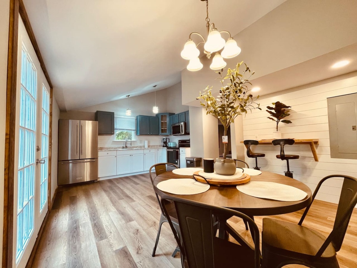 Este alojamiento está en el primer piso, al que se puede acceder desde el patio trasero y subir las escaleras hasta una terraza totalmente amueblada. Entra por las puertas francesas en el área del comedor amueblada con mesa de comedor y 6 sillas. La cocina está completamente equipada con especias, vajilla, vajilla, ollas y sartenes. Hay un dormitorio con cama tamaño queen, seis cómoda y dos mesitas de noche. La sala de estar cuenta con un sofá en forma de L, en el que uno puede dormir, la televisión en streaming se encuentra encima de la chimenea eléctrica de imitación, mesa de café de mármol.
