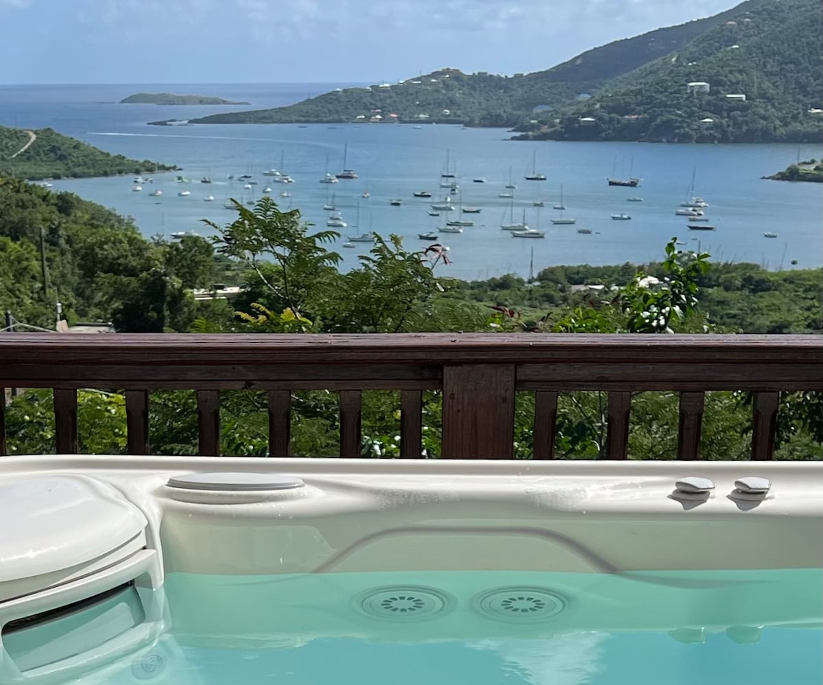 Preciosa casa de campo con 180 grados de vistas a las aguas blancas. Puedes ver y oír las olas rompiendo debajo. Aire acondicionado, privado, romántico con una hermosa ducha al aire libre. Acuéstate en un nido de intimidad. Sumérgete en las brisas de la isla. Disfruta de las vistas del sol naciente y la luna mientras brillan a través de las aguas cristalinas de Hurricane Hole. Adáptate al ritmo de la vida en la isla con energía solar y agua de lluvia purificada, recomendaciones ingeniosas, consejos y sugerencias de expertos. Bienvenido a la elegancia sencilla.