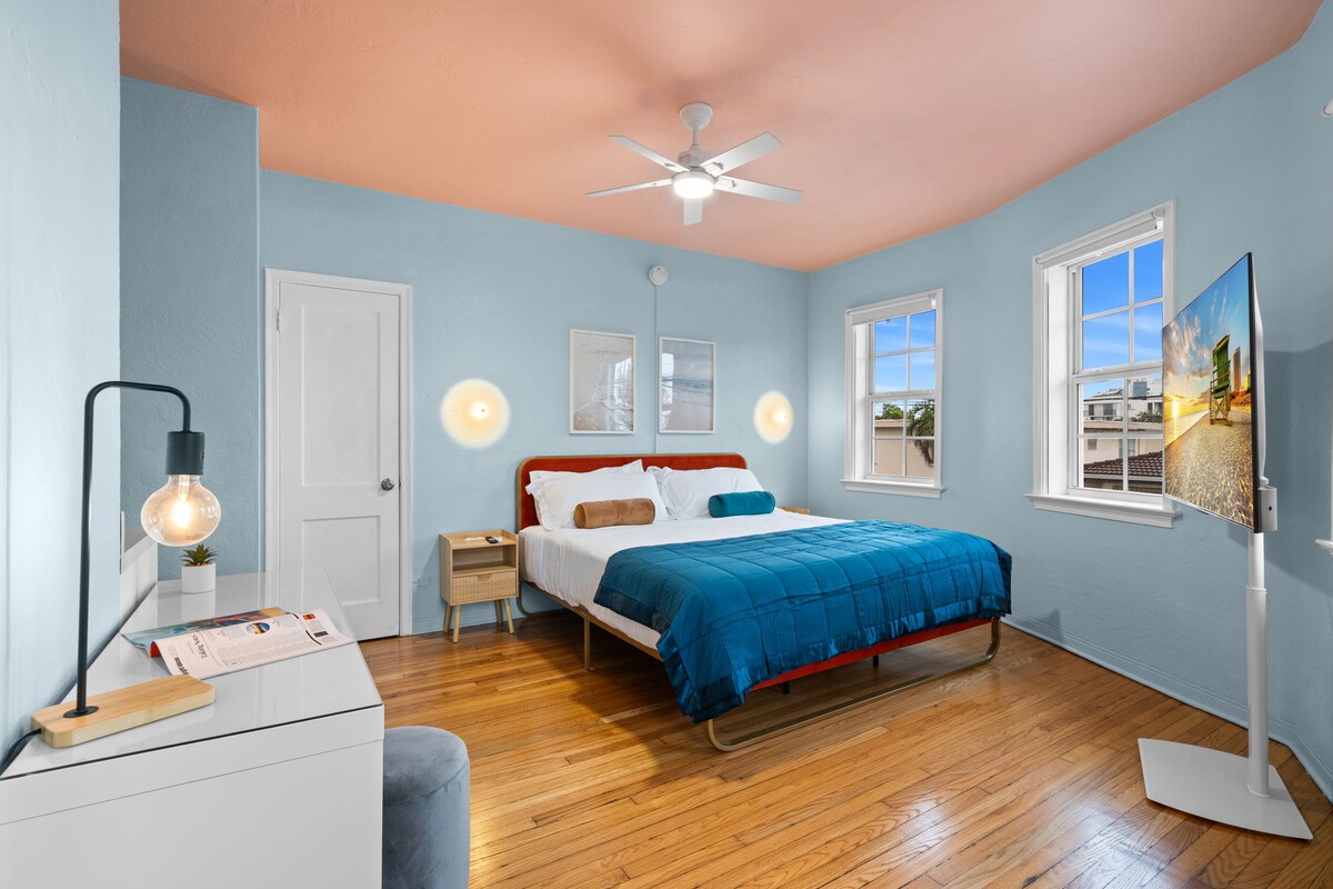 Deja tus maletas y siéntete como en casa. ✨Este alojamiento es una habitación privada con una cama tamaño «king», suelos de madera, dos espacios de baño separados, un escritorio, una caja fuerte en la habitación, toallas de playa y un minifrigorífico. Los huéspedes pueden disfrutar de una piscina en el patio con cabañas privadas, una impresionante terraza solárium y una piscina en la azotea con vistas a la ciudad y al mar. El alojamiento se encuentra a unos pasos de la famosa Collins Avenue y la playa, cerca de restaurantes y vida nocturna.