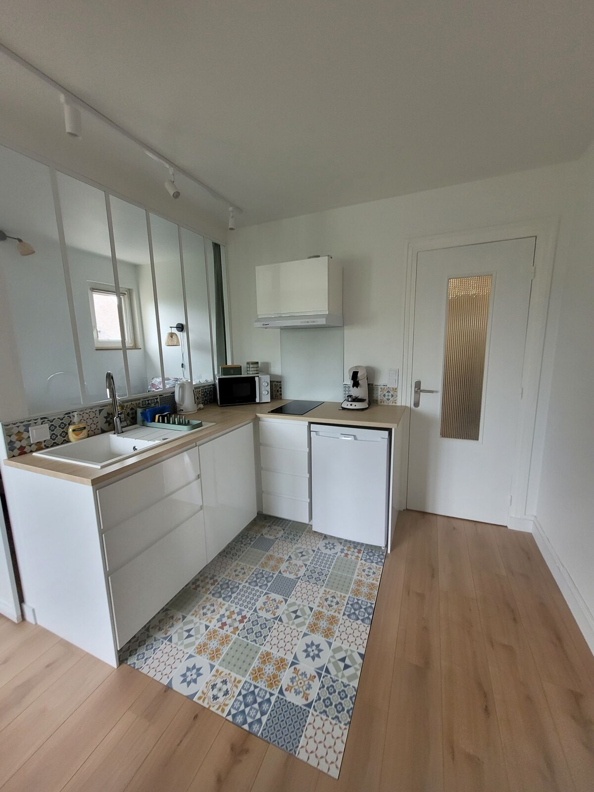 Relájate en este alojamiento tranquilo y elegante Te alojarás en un estudio situado a 2,5 km del centro de Caen y de la estación de tren. Parada de tranvía (Modigliani) a 200 metros. Cama doble hecha a la llegada, TV, wifi (fibra), cocina equipada (vitrocerámica, nevera, microondas con grill, Dolce Gusto), baño con ducha/WC/lavabo/secador de toallas, lavadora secadora Sábanas y toallas incluidas Situado en la planta baja con terraza privada Estacionamiento y estación de carga gratuita en nuestro patio privado.
