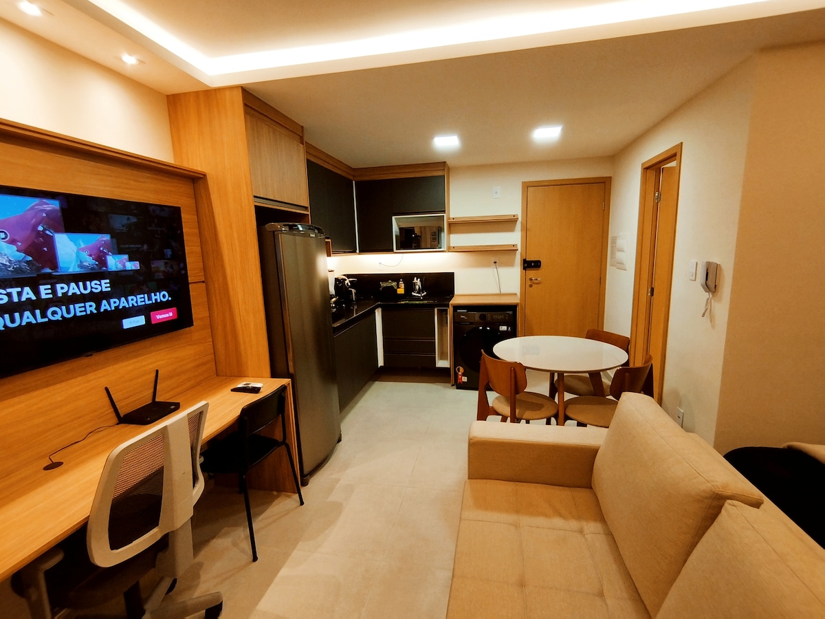 Apartamento tipo estudio súper confortable con una ubicación inmejorable para sus compromisos laborales y/o de ocio. ► Cama doble con colchón de muelles; ► Smart Tv 40” (incluye Netflix, Prime Video, Disney+ y Globoplay); ► Aire acondicionado; ► Ventilador turbo; ► Persiana tipo blackout; ► Armario con perchas; ► Altavoz bluetooth; ► Mesa de estudio/trabajo con lámpara; ► Sofá cama para parejas; ► Mesa de alimentación; ► Cocina equipada para preparar comidas sencillas.