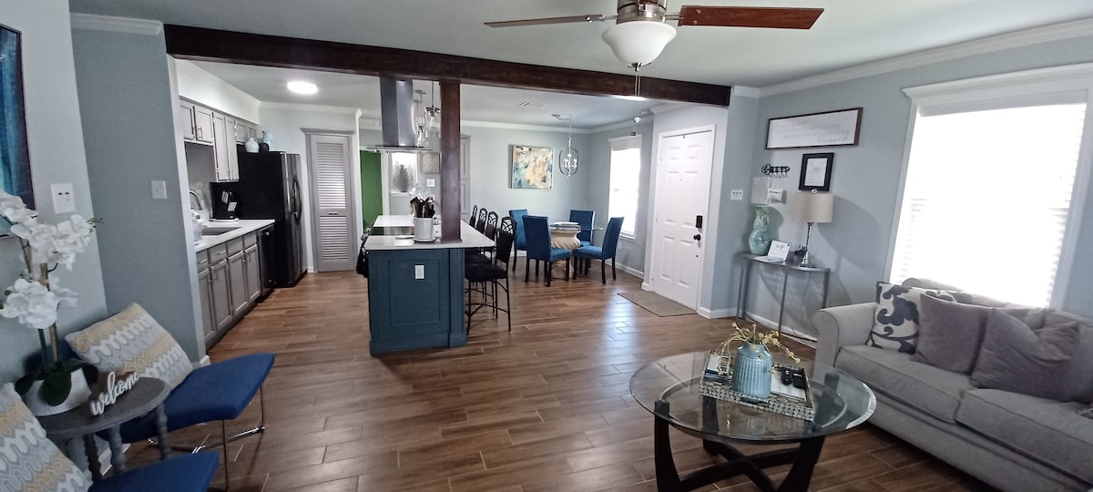 Hogar de escapada perfecto Casa de 1400 pies cuadrados 3 dormitorios/2 baños completos. Dormitorio principal: 1 cama tamaño king, 1 baño, TV de 65 pulgadas. Segunda habitación: 2 camas tamaño queen, TV de 65 pulgadas. 3ª habitación: 2 camas completas. Baño completo para huéspedes Armarios para guardar pertenencias en todas las habitaciones. Espacio de sala de estar grande de diseño abierto/comedor Cocina completa Estufa, nevera, freidora de aire, Keurig, microondas ¡El aire acondicionado enfría! Barbacoa en el patio trasero Lavadora y secadora Accesorios de playa Aparcamiento para 2 vehículos en la entrada/garaje accesible, se permite el estacionamiento en la calle.