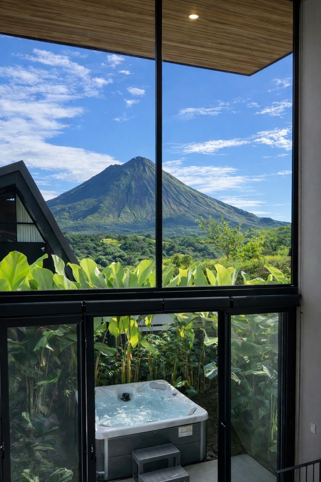 Un hospedaje para escapar de la rutina y conectar con la naturaleza, tiene un diseño moderno con una cálida decoración, rodeado de naturaleza donde podrás observar muchas aves, una linda vista al volcán, balcón, terraza, una refrescante piscina y jacuzzi privado. Un lugar ideal para parejas, amigos o para que puedas teletrabajar tranquilamente. Ubicados estratégicamente cerca de todas las actividades principales y a tan solo 2.5 km del centro de La Fortuna y a 1 km de La catarata La Fortuna.