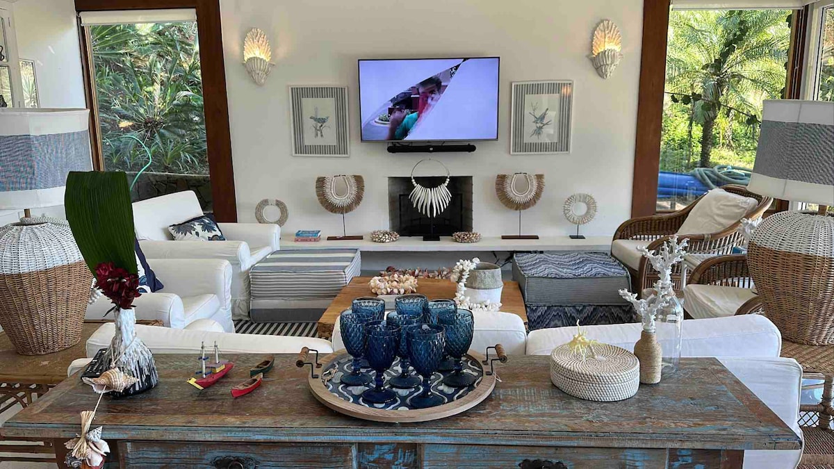 El grupo estará cómodo en este lugar espacioso y único. Las 4 suites con vistas al mar y espacios integrados con la naturaleza . Zona social y balcón gourmet todo frente a la piscina , con borde infinito,muy verde , barbacoa , horno de leña, chimenea , cocina equipada, jardín , ducha al aire libre Wifi de fibra óptica Hecho en casa disponible ( para combinar ) Creamos un instituto de la casa , Villadasgracas,¡sigue ! Tenemos más fotos actualizadas