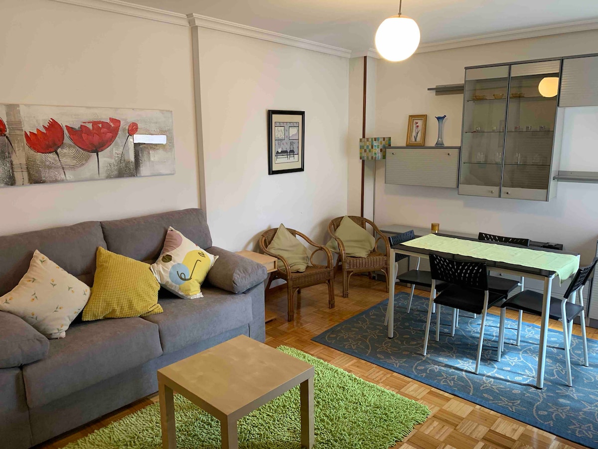 Aparcamiento incluido. Muy buena situación: cerca del centro de Oviedo, bancos, buses y taxis. Los muebles de las habitaciones y salón son nuevos, las camas dobles de 1,50 de visco, exterior, muy soleado. TV en las habitaciones. Wifi gratis y calefacción. Incluye plaza de garage, y es gratis aparcar en la calle en esta zona justamente. Quinta planta sin ascensor, pero fáciles de subir :) Hay caja fuerte, cafetera dolce gusto, tostadora y todo el menaje. Te encantará el apartamento :)