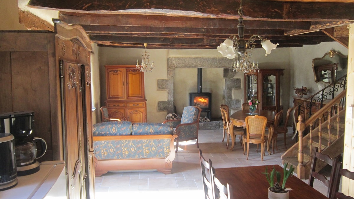 Buscas un alojamiento diferente a los demás. Al renovarlo, queríamos muebles que no encontrará en casa de todo el mundo, muebles de madera, que tengan encanto, una historia, la mayoría de las veces fabricados en Francia. Este concepto aporta serenidad, calma y confort. La renovación también se elige en armonía respetando la ecología: las paredes de cáñamo/cal, el aislamiento de paja, los tabiques de madera, las losas de pizarra en el baño y el inodoro.