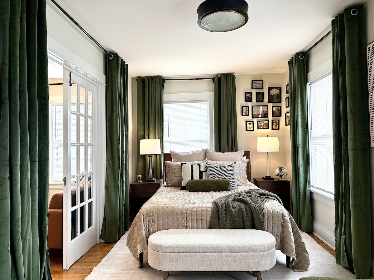 ¡Nuestro pequeño estudio Boho en el último piso de un tranquilo 4-plex es lo último en comodidad moderna! Cada detalle está diseñado pensando en el lujo, incluyendo una cocina y baño personalizados, cortinas de terciopelo y acabados finos. Relájate con estilo en una lujosa cama tamaño king, un sofá cama de matrimonio, una cocina bien equipada, lavadora y secadora, un patio y un aparcamiento privado. Estamos ubicados en Little Bohemia, cerca del centro de la ciudad, CWS y el zoológico. La limpieza mejorada y el registro autónomo garantizan que estés en buenas manos. ¡Reserva ahora para una estancia inolvidable!