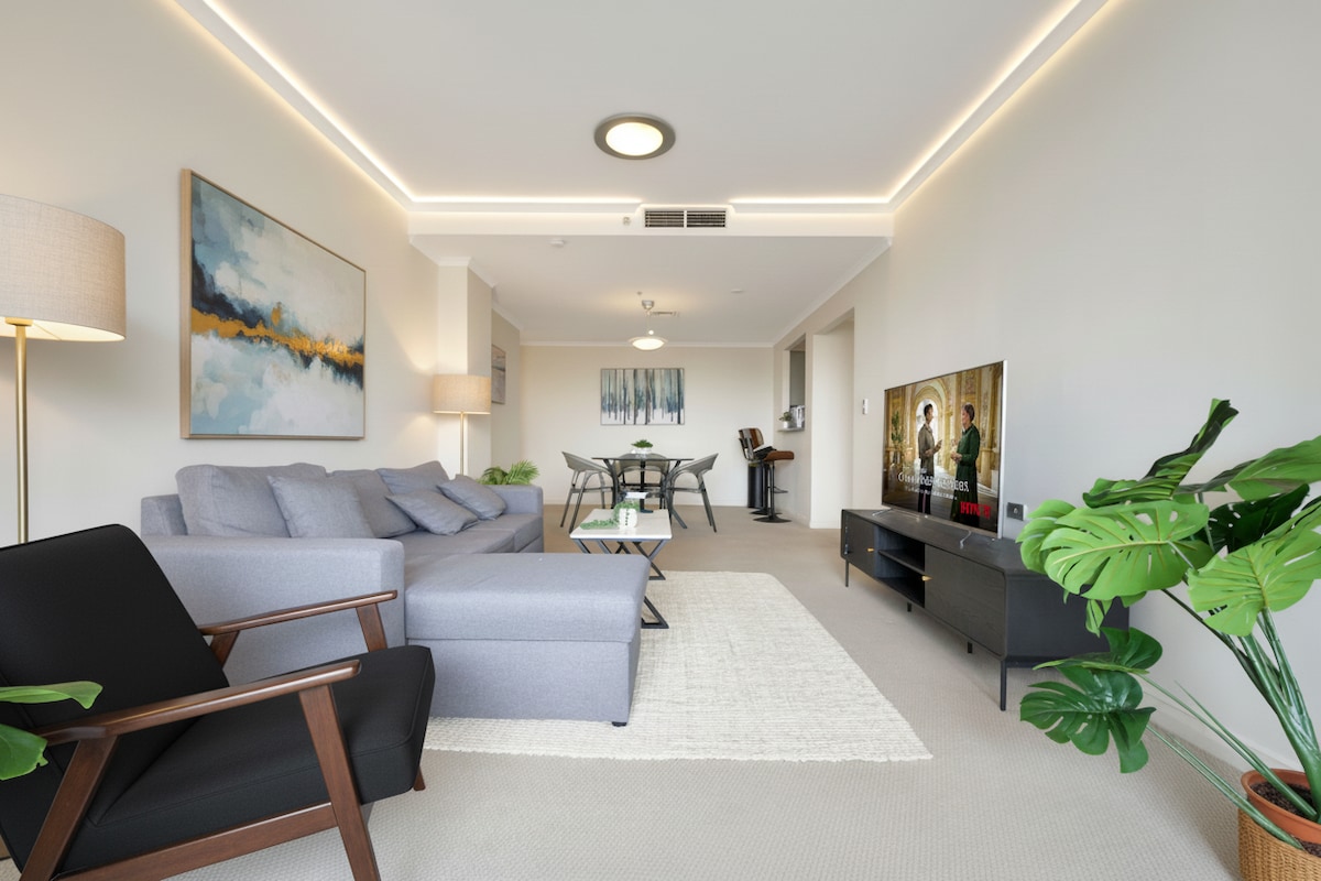 • Sleeps up to 6 guests • 2 Bedroom Apartment with Queen Beds • Double Fold Out Sofa Bed + TV in Living Room • Private Balcony • Reverse Cycle Ducted Air Conditioning • Pool + Gym + Sauna • Dedicated Parking Space (height clearance 1.9 m) • Internal Laundry (Washer & Dryer) • Easy 24/7 Check-In • Discounts for 21+ night stays • Telstra 5G Wi-Fi • Steps from Light Rail, Ferry & Bus Stops