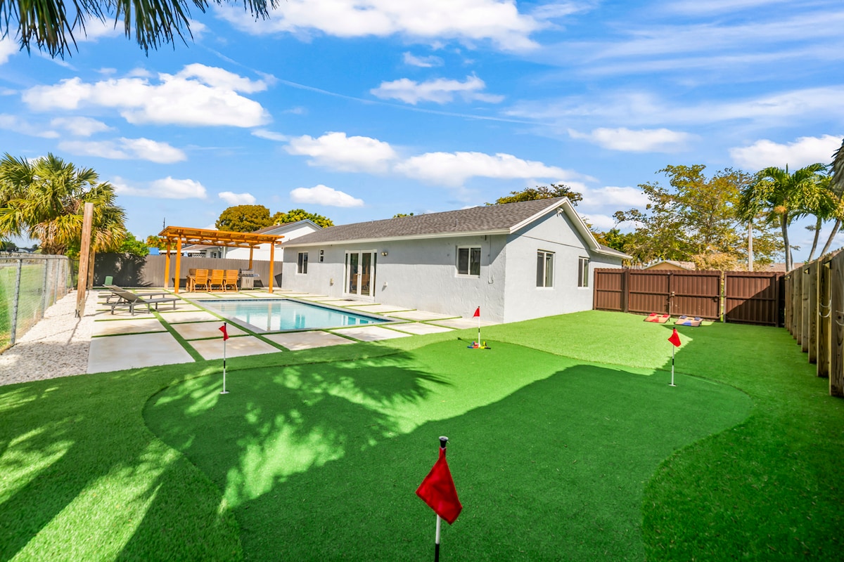 Casa renovada ideal para familias. 5 habitaciones y 4 baños completos. Piscina climatizada todo el año, mini golf, BBQ y swing. Diseño moderno con piano y 6 TVs. Parqueo gratis para 5 autos. Cerca del aeropuerto, playas y vida nocturna. (Capacidad: 1 king, 2 queen, 2 full, 2 twin y 2 sofá cama – full y queen / Hasta 16 huéspedes si son 2 por cama / Informar total de personas al anfitrion).(si traen perro siempre agregarla en la reserva(Si viajan con niños, avisar para instalar malla de piscina).