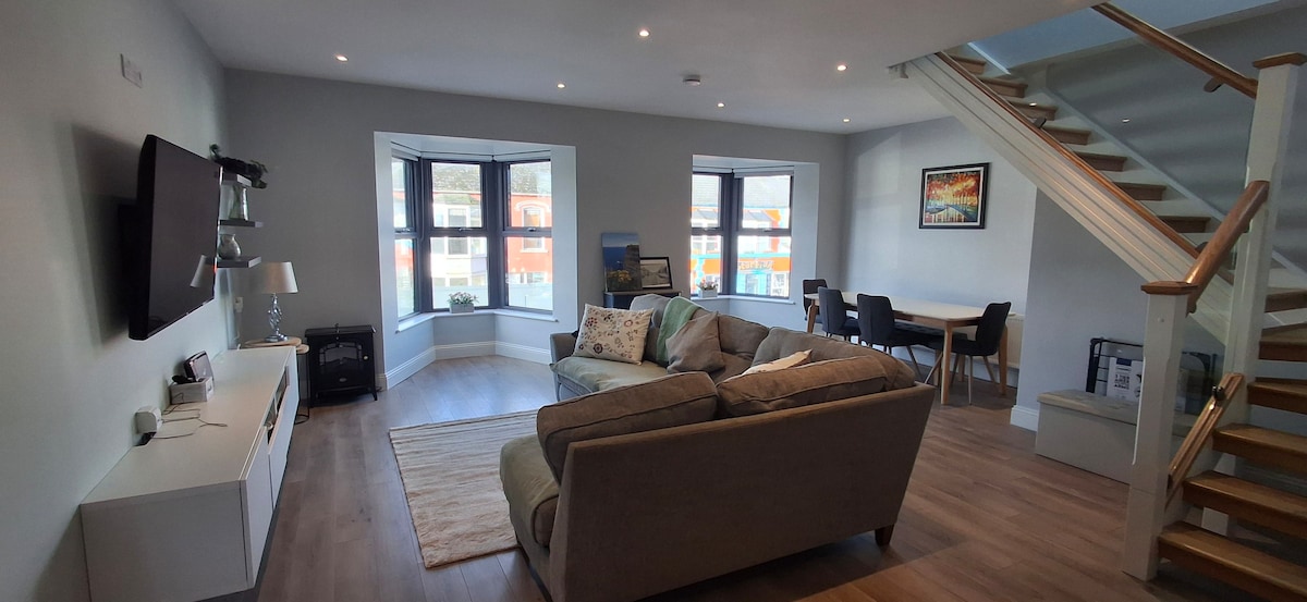 Nuestra casa adosada es un hogar lejos de casa ... con las vistas adicionales del mar y a 2 segundos a pie de la playa. Ubicado en 3 pisos con cama doble en el piso superior con baño privado, cocina/sala de estar en el piso medio y 2 dormitorios en la planta baja con ducha de baño incluido ( camas individuales individuales individuales en habitación grande y literas individuales en otra habitación). Lleno de luz y vistas increíbles al mar desde los pisos central y superior. La playa está a 50 yardas de la casa para que te relajes, nadas, construyas castillos de arena o praces surf.