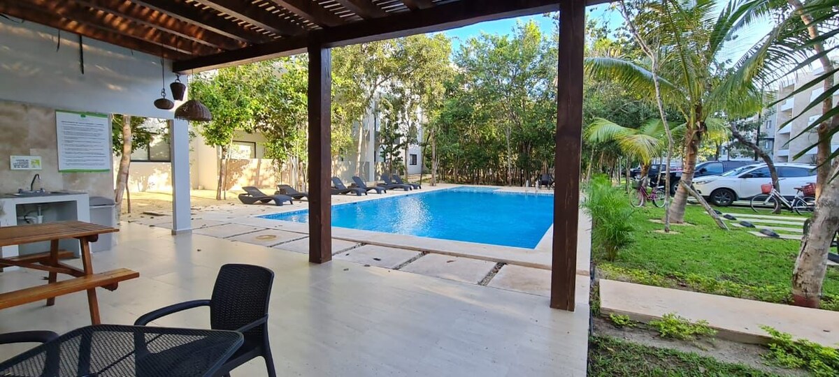 Come and enjoy a quiet and a nice place, with pool, terrace, lounge chairs and hammock. In the kitchen utensils to cook. In the bathroom we put towels, shampoo, body wash 🧴 It is close to Chedraui, you can walk there 5-8 minutes. Is one block from the Main Street Juarez Avenue, were you can take a taxi or a van. In Juarez avenue are few small restaurants, laundry, groceries store Oxxo. It is 3 blocks from hiway where you can take the vans to Tulum or Cancún. 20 minutos walking to the beach.
