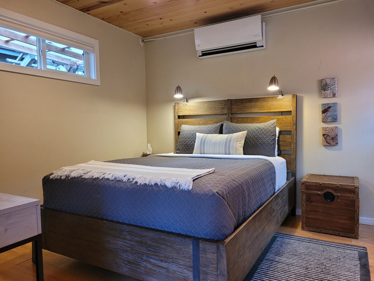 Encantador, 250 pies cuadrados. Loft de invitados en bungalow en el sur de Eugene con entrada exterior privada (10 escalones), ideal para 1 huésped. Baño privado completo con lavabo, inodoro y ducha.* Cama tamaño queen con cómodo colchón de espuma viscoelástica, funda de bambú y ropa de cama de calidad. *Aunque la altura del techo del baño es de 7'6” en el nivel más alto, ten en cuenta que los techos en ángulo en la ducha pueden proporcionar un espacio para la cabeza menos que ideal para los huéspedes altos. El cabezal de la ducha es extraíble/de mano para mayor comodidad.