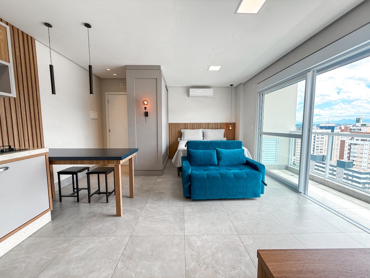 Apresento a você um studio moderno, prático e totalmente mobiliado, localizado no HUB Smart Home, estrategicamente no centro de Criciúma. SOBRE O STUDIO O studio é todo mobiliado, equipado e fica a poucos metros de supermercados, farmácias, lojas, hospitais e restaurantes. Trazendo toda a praticidade e conforto que você procura. SOBRE O HUB O edifício é todo automatizado - feito para Airbnb. Nele você tem acesso à academia, área de coworking 24hrs, lavanderia, mercado autônomo e bicicletário.
