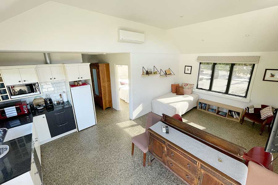 A pocos pasos del pintoresco Old Cromwell, disfruta de una estancia cómoda en este estudio reformado con buen gusto. El estudio de una habitación tiene todo lo que necesitas: una sala de estar principal con cama tamaño queen, sala de estar, cocina pequeña y comedor, y un amplio baño separado. Muebles y obras de arte cuidadosamente seleccionados adornan el espacio, para crear una sensación elegante pero acogedora. Las ventanas altas proporcionan privacidad y capturan las colinas que rodean Cromwell. En el exterior, disfruta de una copa de vino en el patio privado bañado por el sol.