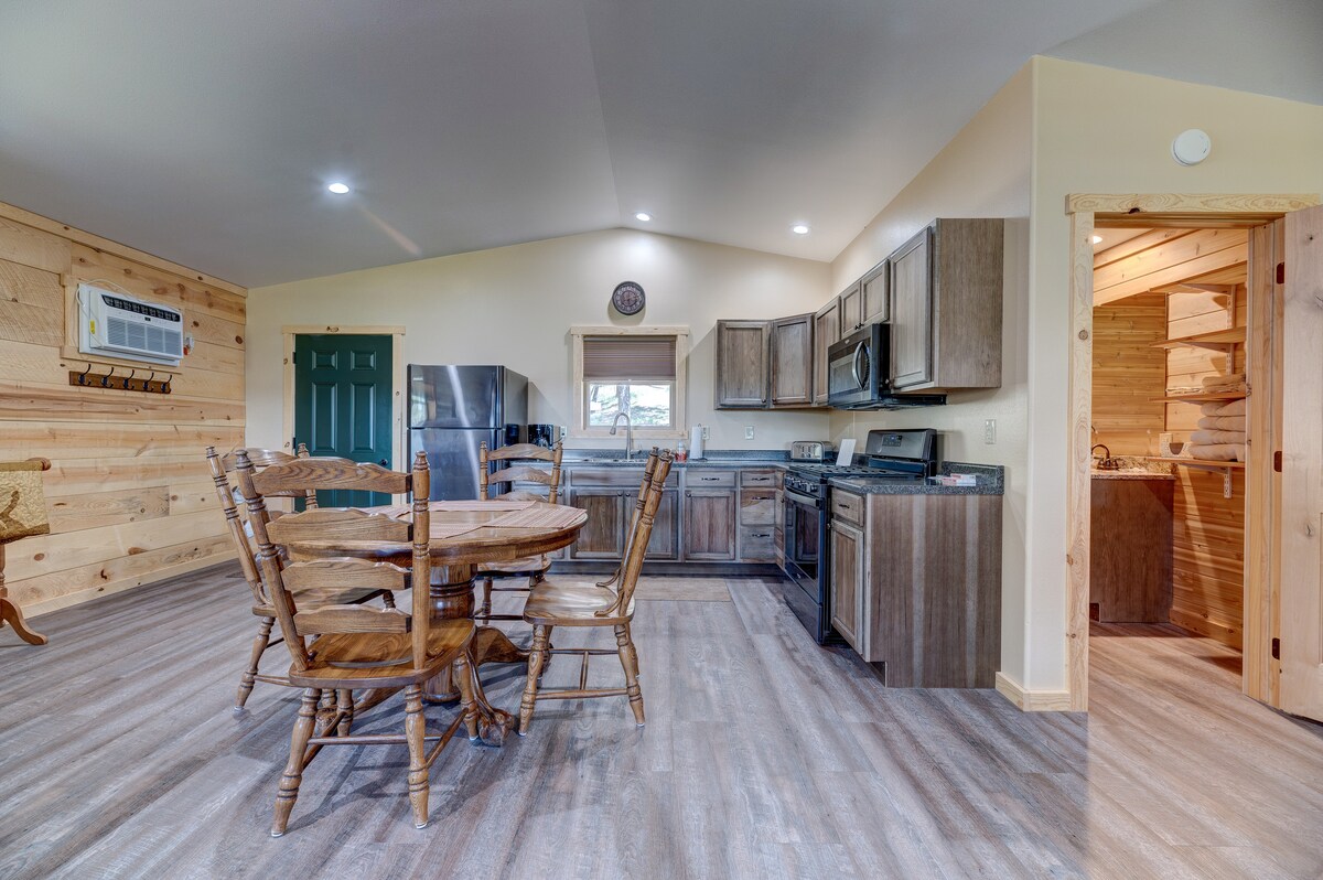 Relájate enclavado en los pinos disfrutando del aire libre en todo su esplendor. La casa del rancho tiene una sala de estar bellamente decorada con una cama queen plegable, literas dobles, dos acogedoras habitaciones con camas tamaño queen. 1,5 baños con ducha. Se proporcionan toallas, ropa de cama y secador de pelo. La cocina está totalmente equipada con utensilios básicos, cocina de gas, nevera y una parrilla de gas en el patio. Televisor que puede utilizar el wifi gratuito para su streaming favorito. Cartas, libros, cribbage y otros juegos disponibles bajo petición.