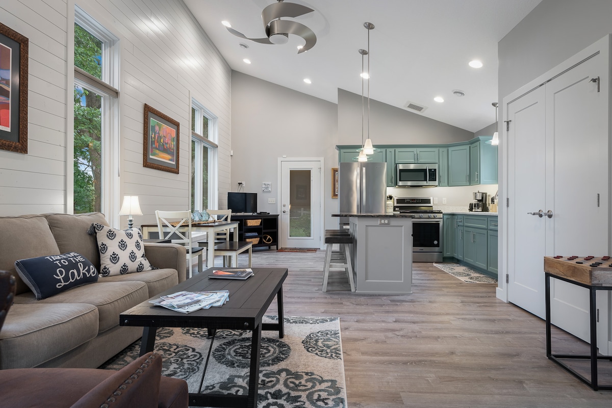 El Adventure Studio es como entrar en una casa en el árbol que cuenta con impresionantes vistas y una acogedora terraza relajante con vistas a 200' de la costa en un gran lago de pesca. En el interior disfrutar de vistas desde dos paredes completas de ventanas, una claraboya y techos abovedados. Cocina bien equipada para una estancia de varios días. Un pozo de fuego, un bote a pedales, tablas de remo, una superficie boscosa, una milla de caminatas por la naturaleza, un sendero para ciclistas y acceso a otras aventuras. Todo en un camino tranquilo bordeado de árboles, perfecto para paseos tranquilos al atardecer.