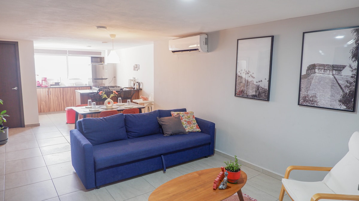 Amplio Departamento con Tapanco , habitaciones climatizadas rodeado de atractivos turísticos, plazas comerciales, a 5 minutos del centro histórico, a 2 minutos de playas y a 12 minutos del Acuario, a pie de playa. -Sala con smart tv y tapanco con red de descanso para adultos y niños. -Comedor y cocina moderna -Recamara principal con cama king size , baño, closet y smart tv -Recamara secundaria con litera matrimonial y una cama individual y closet. -Garage para un auto con portón eléctrico.