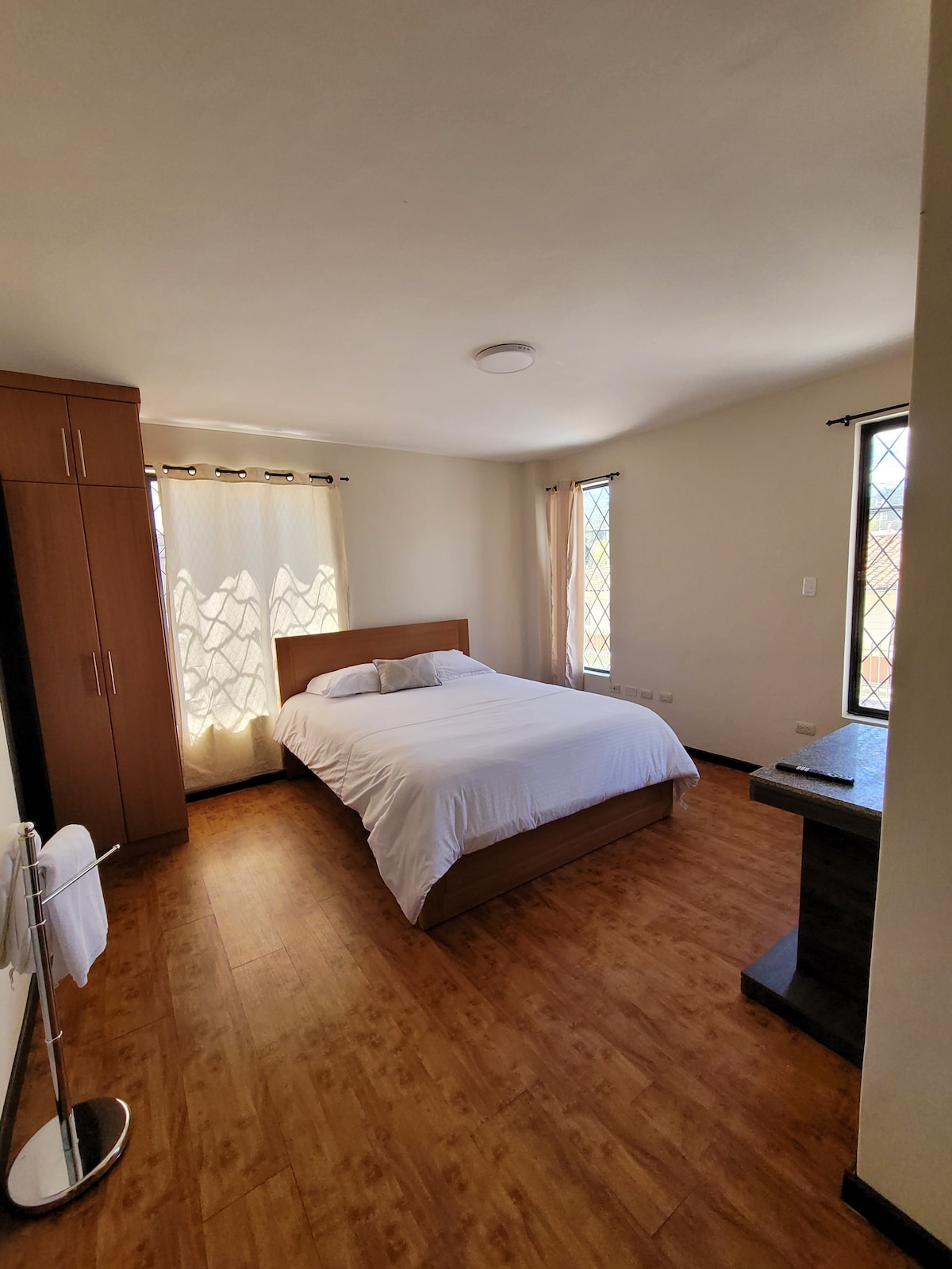 Con excelentes vistas de la Ciudad esta vivienda es lo suficientemente amplia como para que toda tu familia puedan estar juntos, compartir y recordar todas aquellas anécdotas vividas Estamos en una zona tranquila y dentro de una ciudadela a tan solo 7.5 km del Parque Calderon en vehículo harás al rededor de unos 15 minutos de acuerdo al tráfico Con capacidad para 13 personas disponemos de 6 camas y 2 colchones distribuidos en 4 habitaciones. Cuenta con todo lo necesario para disfrutar tu estadía