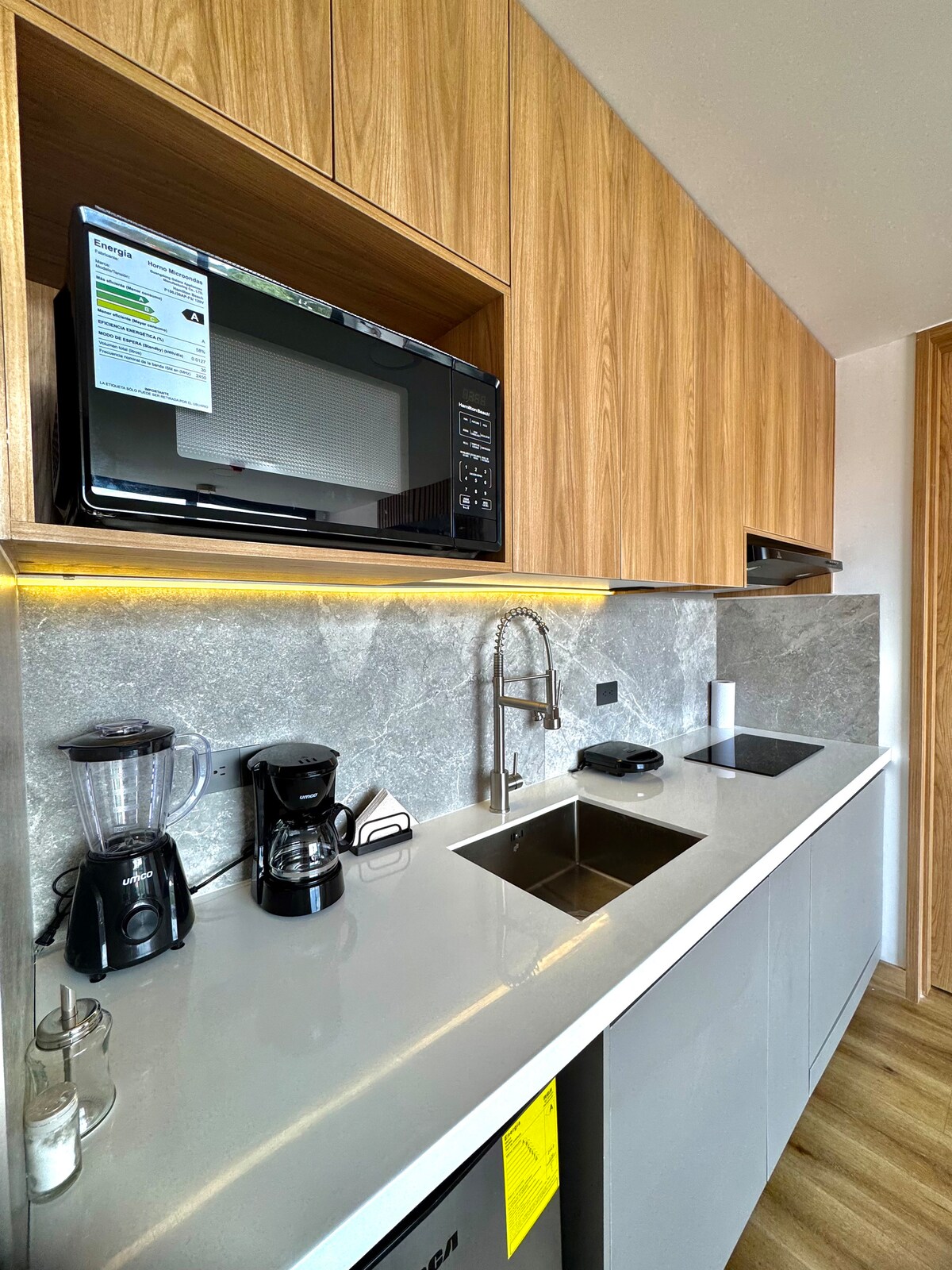 Moderno departamento en el 8º piso con espectacular vista panorámica. 2 habitaciones, TV 85”, terraza con BBQ, sofá cama y escritorio ideal para home office. Cocina equipada, lavandería, WiFi rápido y parqueadero interior. Edificio con gimnasio y excelente ubicación cerca de restaurantes, sitios turísticos y todo lo que necesitas. Además, está estratégicamente ubicado cerca de la autopista para fácil acceso. Perfecto para trabajo o descanso.