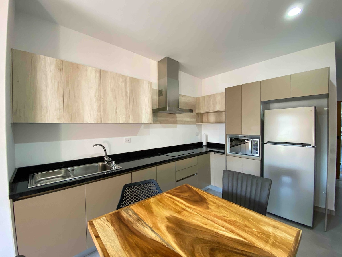 Departamento nuevo en planta baja frente a alberca en excelente ubicación, cerca de Aeropuerto, Hospital Ángeles, Plaza Ceiba y Costco: - Dos recámaras: Principal con cama Queen, secundaria con cama Matrimonial - Cocina equipada - Televisión 4K 55” - Baño completo - Alberca, mesas exteriores y espacio de cowork - Cuarto de servicio con lavadora y secadora Disfruta de una estancia cómoda y conveniente. ¡Te esperamos!