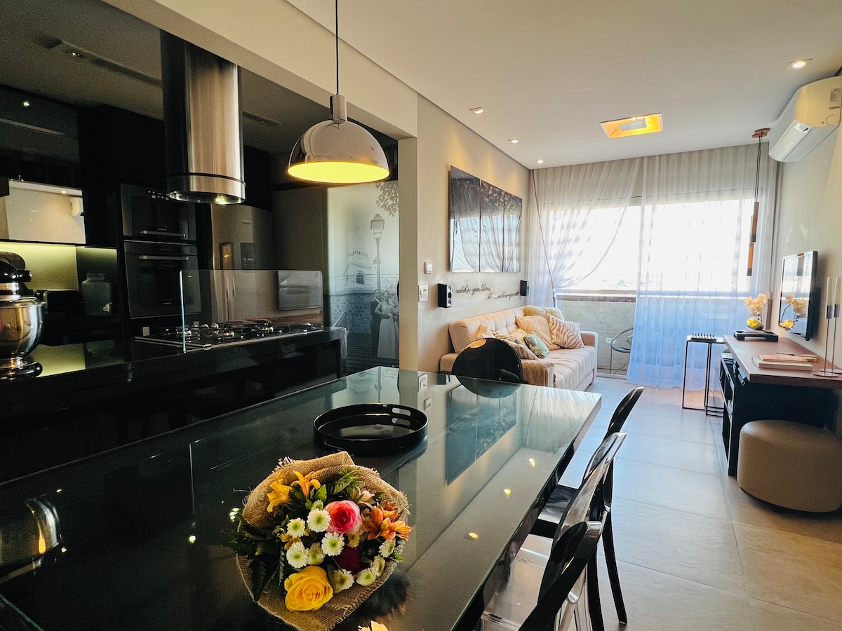 9º andar - 43 m - Barrio Nobre - Balcón gourmet con barbacoa. - NUEVO sofá cama supercómodo - Cocina completa. - Aire acondicionado frío y caliente. - SmarTv - Una plaza de garaje. - Cocina completa. - Wifi de calidad - Filtro purificador de agua. NOTA: No administramos las áreas sociales del condominio. El funcionamiento de estas áreas puede interrumpirse por mantenimiento sin previo aviso. Si se produce, no se reembolsarán los importes.