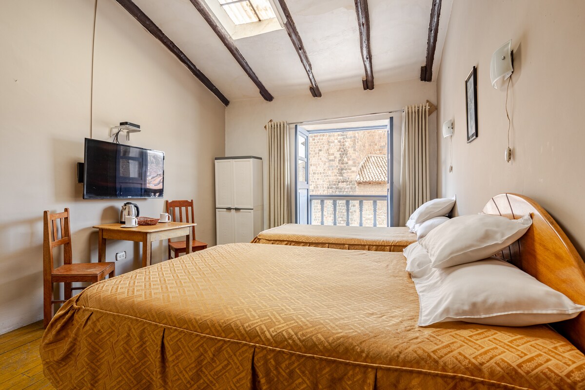 Habitación privada con vista directa al Qorikancha, en el segundo piso de una casa histórica sobre piedra inca. Nota: Pisos de madera (pueden crujir), está en la avenida concurrida (ruido), el tragaluz deja pasar la luz(día). 📍 Ubicación ideal: A 1 min del Qusicancha y la Av. El Sol(principal). A 2 min de la Plaza de Armas. Cerca de todo: restaurantes, bares, joyerías y la estación de tren. ✅ Incluye: WiFi rápido Agua caliente 24/7 TV cable ✨ Perfecto para una experiencia auténtica Cusco✨