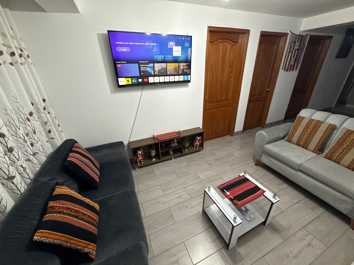 El depártamento se encuentra ubicado en el tercer piso y cuenta con sala, comedor, cocina , zona de entretenimiento y lavanderia y cuenta con 2 dormitorios, todo el departamento tiene luz natural a los dormitorios con ventanas amplias , el departamento es independiente y amoblado, el dia que arrivan a cusco les recojemos del aeropuerto o terminal terrestre para trasladarlos y darles las llaves . pueden hacer uso de la terraza que tiene una linda vista de la ciudad.