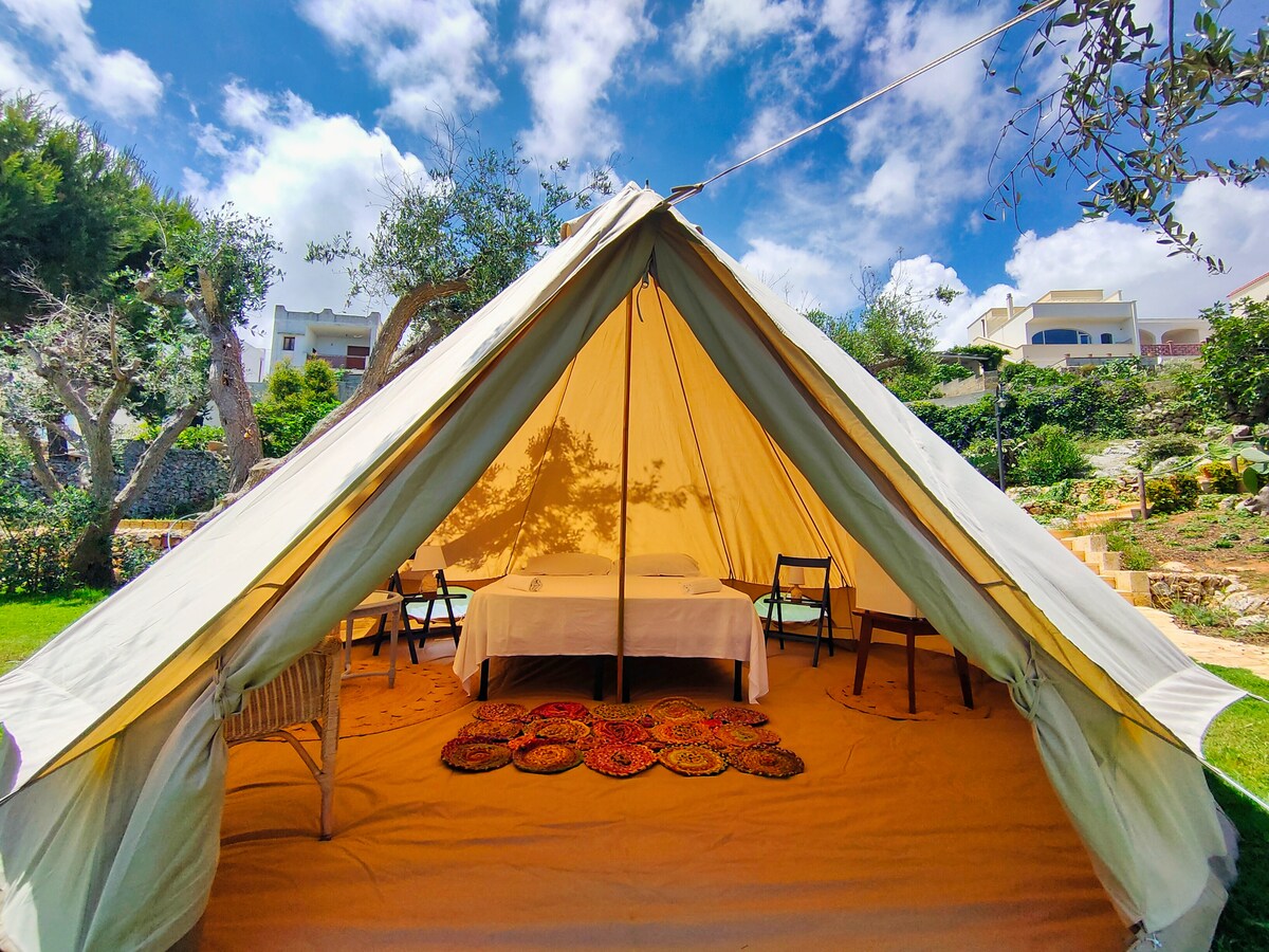 Duerme bajo las estrellas en la tienda glamping de Casa Camilla. Nuestra tienda de campaña de 5 m se encuentra bajo un antiguo olivar con vistas despejadas al mar, justo en el corazón de Marina Serra, a 2 minutos a pie de la piscina natural. La tienda tiene todas las comodidades imaginables: cama, nevera, aire acondicionado y electricidad, baño al aire libre, ducha, lo que proporciona la combinación perfecta de comodidad y naturaleza. El exterior está amueblado con hamaca y zona de estar y también tienes acceso a una zona de barbacoa.
