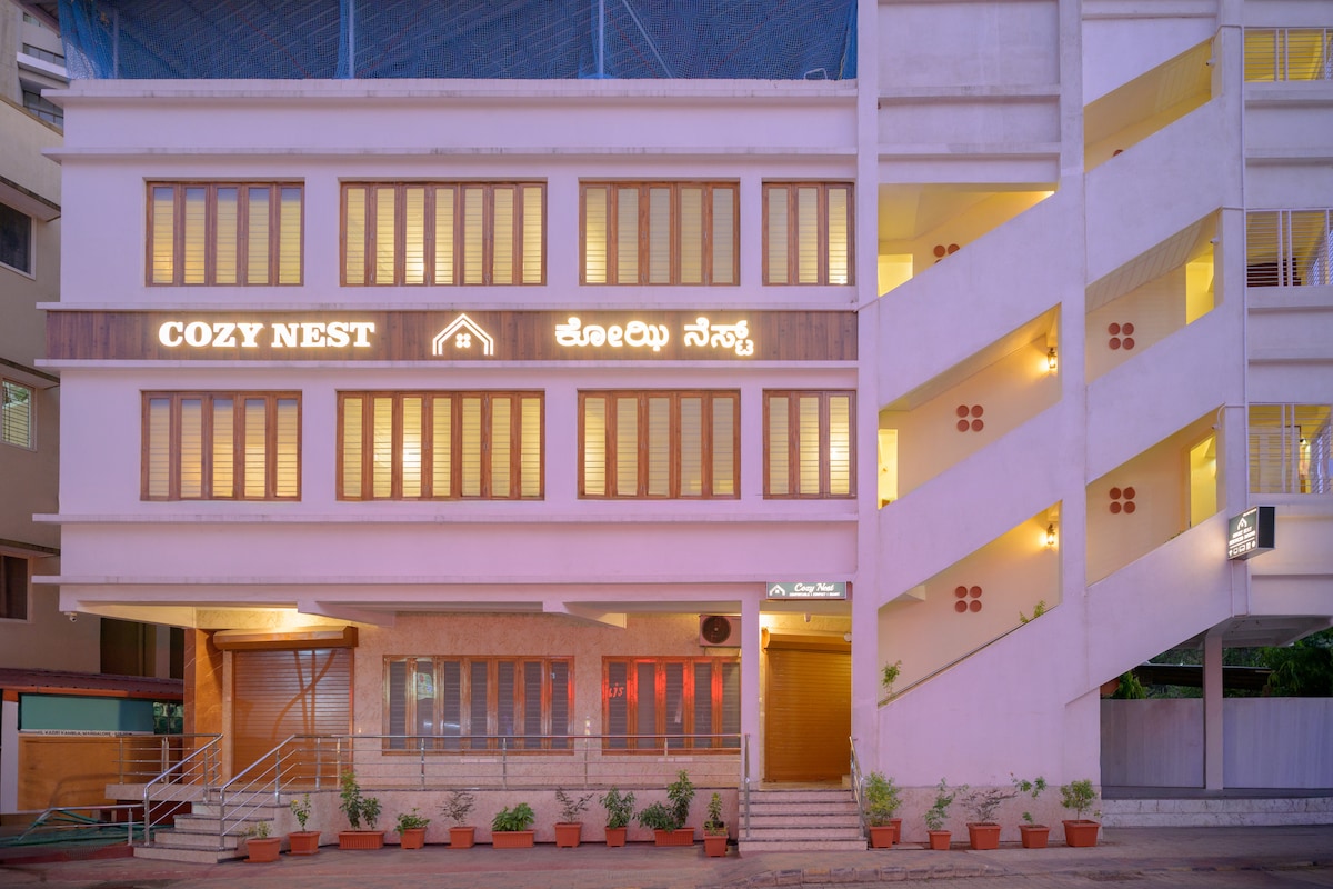 Cozy Nest is a thoughtfully designed, budget-friendly stay in the heart of Mangalore, created for travelers, students, and pet lovers alike. Blending comfort with practicality, it offers compact yet well-planned rooms that prioritize cleanliness, functionality, and a warm, homely vibe. Each space is uniquely named and styled to give guests a personalized experience, while common areas like corridors, reading corners, and cozy nooks add character and charm to the stay.