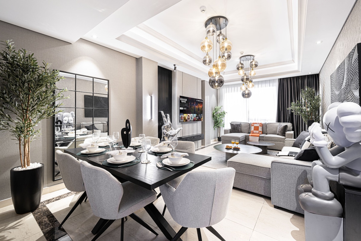 Bienvenido a L'Appartement, un lujoso apartamento de tres dormitorios en el centro de Dubái. Este espacioso refugio presenta un sofisticado estilo parisino contemporáneo y un ambiente de hotel de cinco estrellas. Cada dormitorio tiene un baño privado y un televisor dedicado para mayor privacidad. Disfruta de servicios como gimnasio, sauna y piscina, además de seguridad 24/7. Hay supermercados, barberías, salones de belleza y cafeterías cerca. El centro comercial Dubai Mall está a solo cinco minutos, por lo que L'Appartement es ideal tanto para estancias cortas como largas.