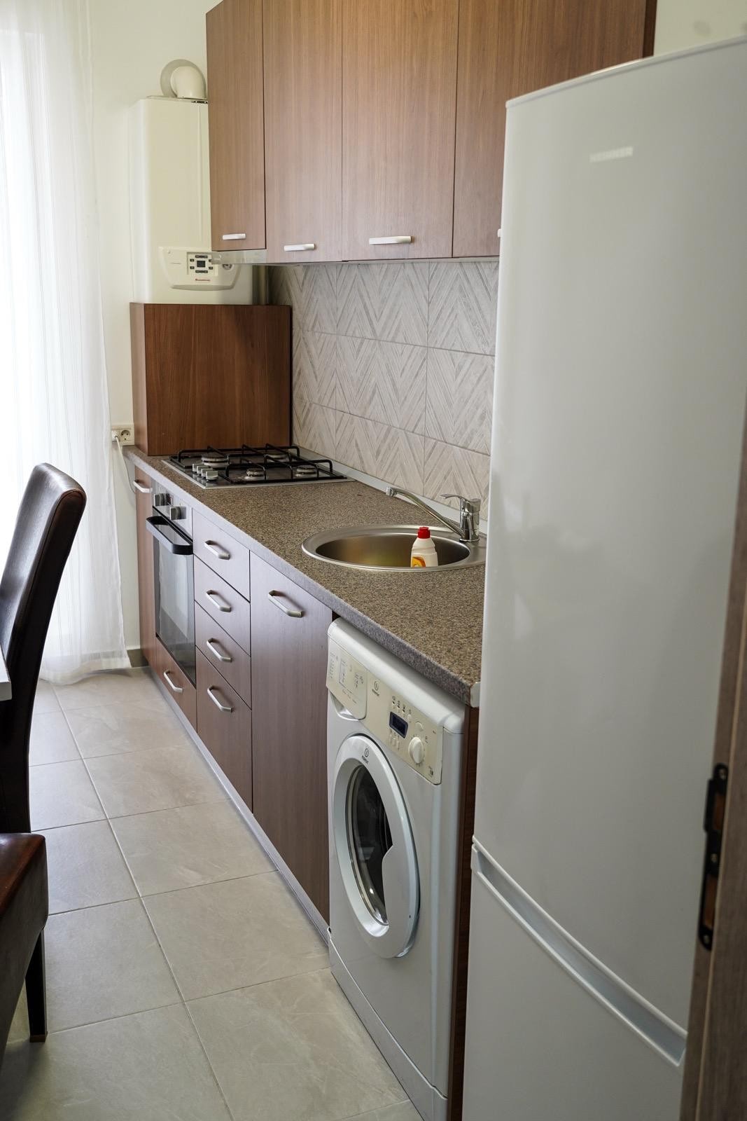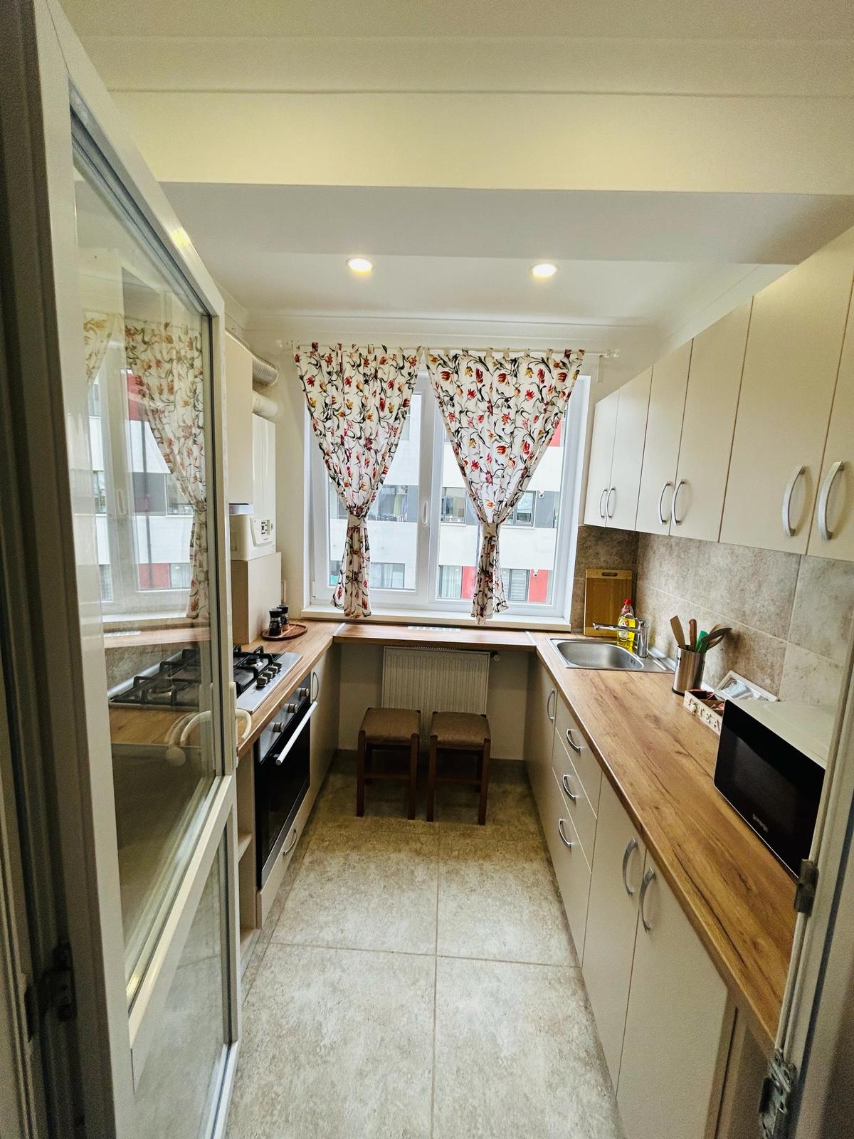 La casa tiene 2 habitaciones y está dividida de la siguiente manera: - comedor y cocina - Habitación con cama tamaño king. - Baño con tina - Balcón abierto. El edificio está situado en la zona antigua de la comuna de Chiajna, rodeado de casas y edificios de baja altura, lejos de la zona concurrida del nuevo barrio (Militari Residence) El apartamento se completó en 2025 y todas las comodidades son nuevas Calefacción propia, aire acondicionado, cocina totalmente equipada y todo lo necesario para una estancia corta o prolongada.