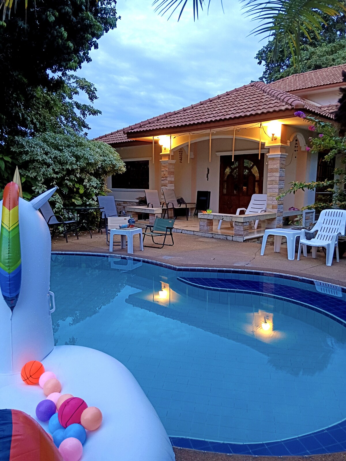 Disfruta de momentos especiales con vistas al Jardín Tropical en este alojamiento especial y familiar. Utiliza la piscina y la terraza para relajarte. Usa Netflix. Una pequeña nevera actualiza lo necesario. El aire acondicionado se enfría a una temperatura agradable. Se puede utilizar un scooter con una pequeña tarifa. En la nueva cocina al aire libre puedes preparar tus platos. Hay un gran mercado de alimentos cerca. Hay numerosos restaurantes cerca.
