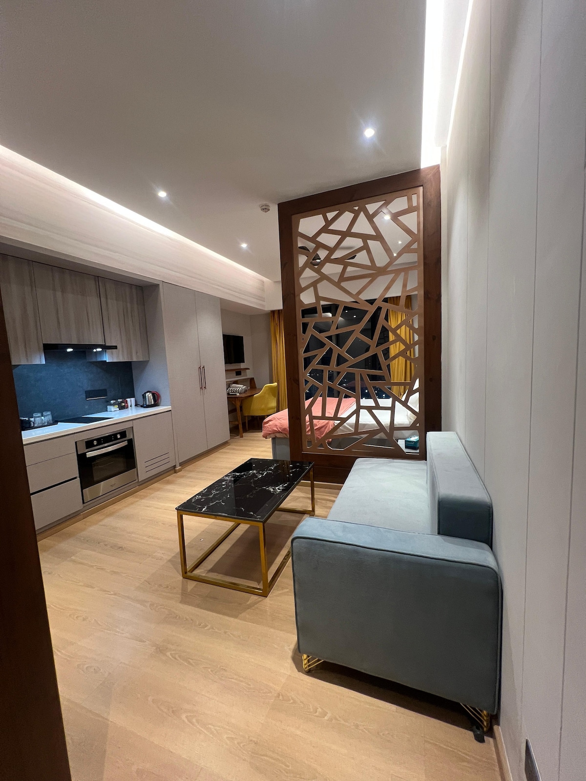 Our newly constructed 2 BHK apartment blends modern comfort with natural charm. The space features 2 serene bedroom with a queen-size beds, a spacious living room, a well equipped kitchen, 2 bathrooms: one attached to the master bedroom and another accessible from the living room and second bedroom and L- shaped balcony offering great view of the city. The property is located near a premium mall in Noida! This well-situated location offers you the convenience of shops, cafes, and entertainment.