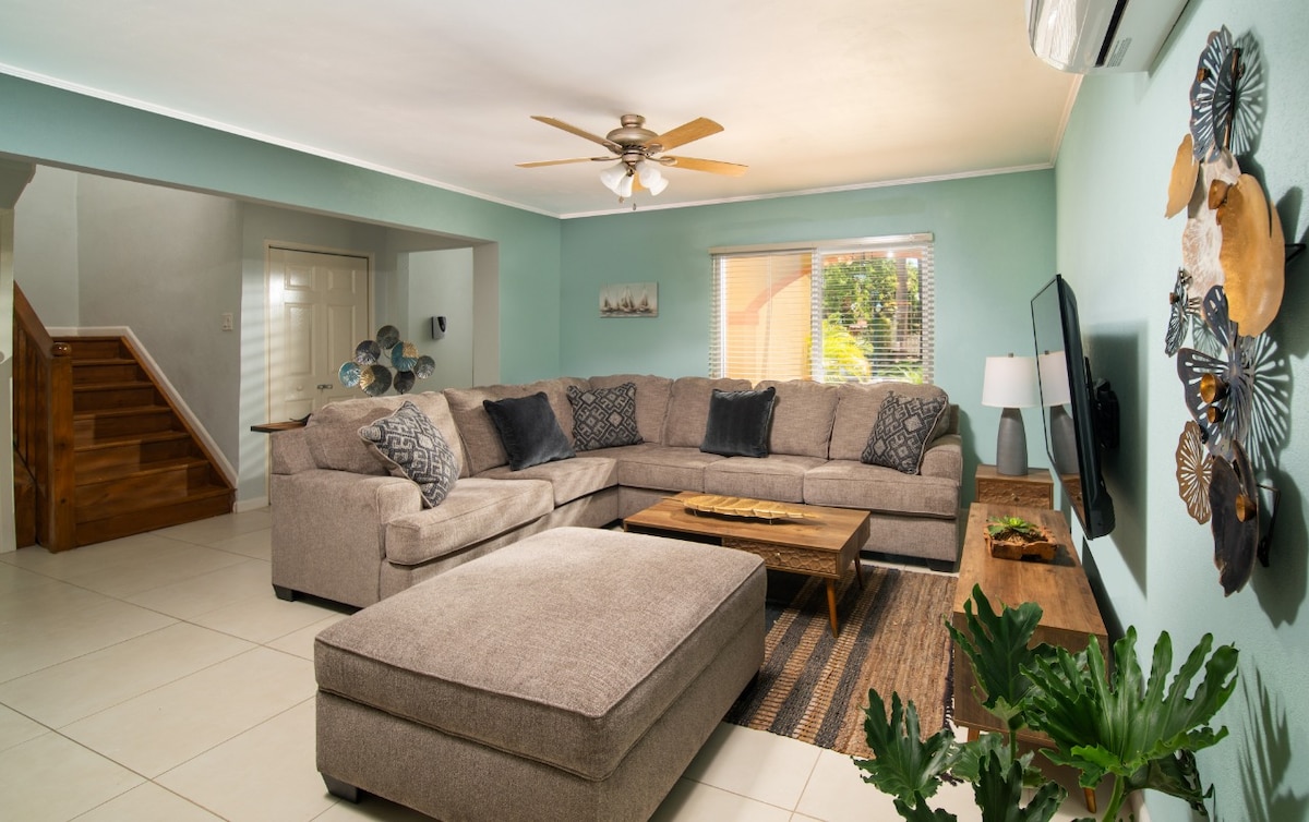 Para una auténtica experiencia jamaicana mientras estás de vacaciones o de negocios en Bahía Montego, esta unidad de dos dormitorios y dos baños se encuentra en la comunidad cerrada las 24 horas de Chatham Palms, enclavada en medio de la vegetación tropical y también a poca distancia a pie de: • Margaritaville (8 minutos a pie) • Salón de juegos/entretenimiento Coral Cliff (8 minutos a pie) • Restaurantes (Usain Bolt's Tracks and Records, Burger King, Pot Pit, etc.) • Consultorio médico y farmacia.