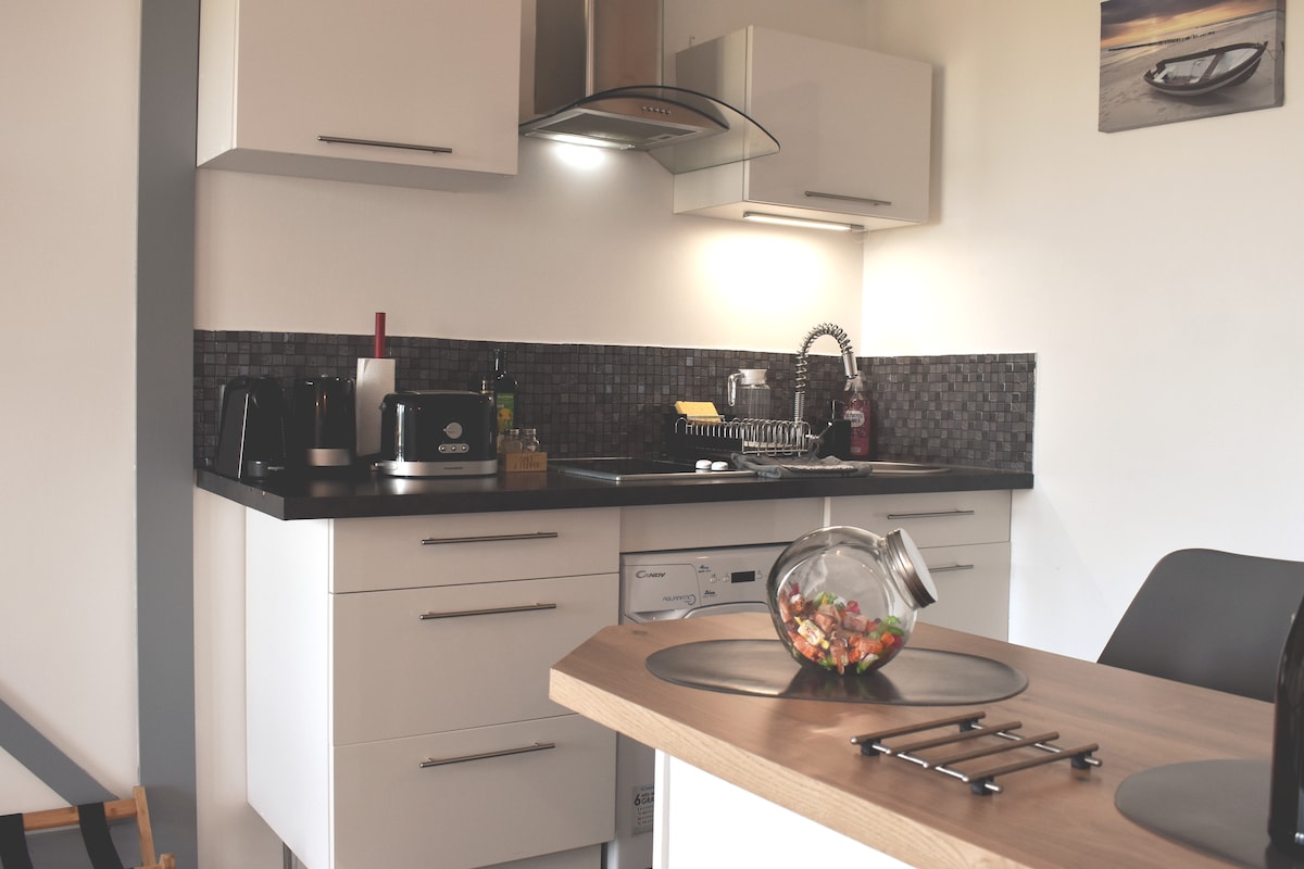 Disfrute de nuestro estudio con balcón orientado al sur y bañera de hidromasaje en la Marina. Está equipado con una cama de 160x200 con sábanas de lino, wifi, TV conectada, cocina equipada con lavavajillas, cafetera de granos orgánicos con molinillo, té orgánico y sodastream, 1 botella de sidra local fresca de regalo, wifi. Relajación asegurada en el baño equipado con una bañera de hidromasaje para una persona. Los inodoros están separados. Hay un aparcamiento gratuito al pie del edificio.