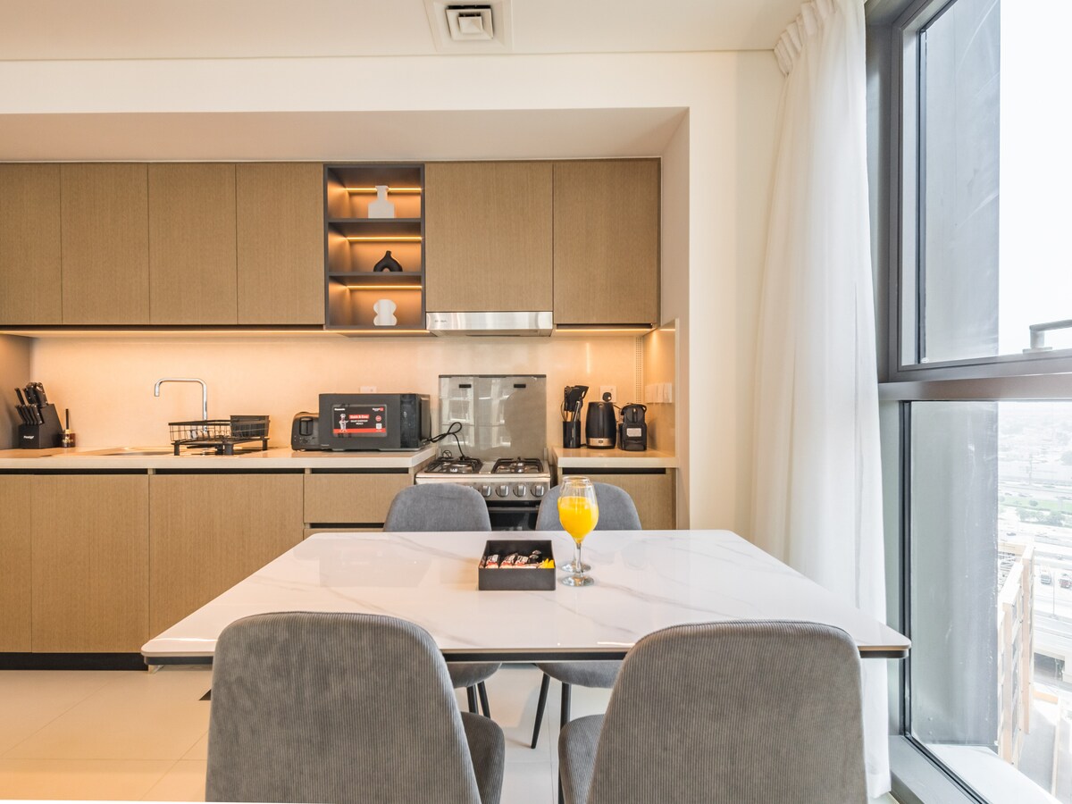 ¡Vida de lujo en Port de La Mer! Disfruta de una cama tamaño king Four Seasons con colchón y sábanas de primera calidad, sofá cama para 2, chimenea de vapor segura, secador de pelo Dyson, cafetera De'Longhi y esterilla de yoga. La mesa del comedor también sirve como espacio de trabajo. Piscina, aparcamiento y acceso a la playa privada incluidos. A pasos del mar, cafés cerca, a 15 minutos del centro comercial Dubai Mall y a 20 minutos del aeropuerto, ¡perfecto para huéspedes que buscan algo especial!