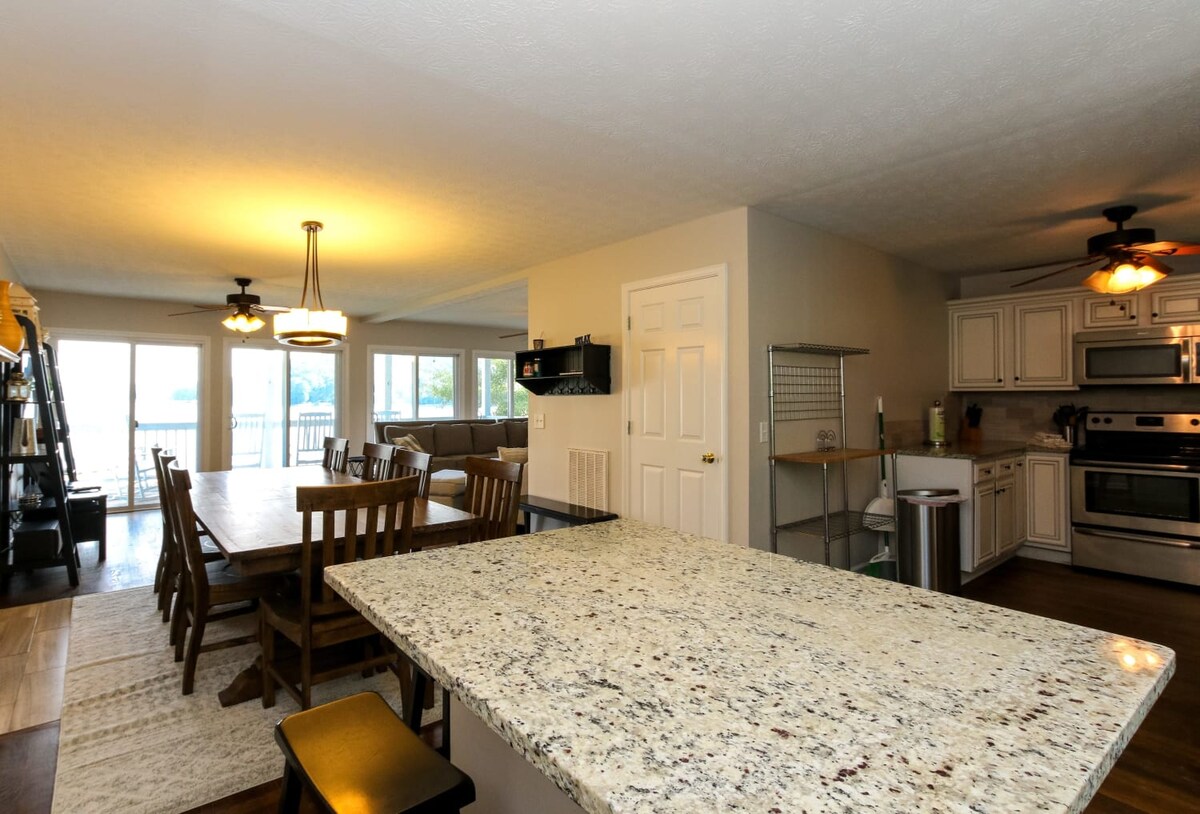 Lake Front • 6 Bedrooms • 4.5 Baths • Sleeps 14 Moonset Vista offers sweeping lake views and an unbeatable location just steps from the beach and a short walk to the Mushroom Pool. With space for up to 14 guests, this home is ideal for multiple families gathering together. Expansive windows throughout allow you to enjoy beautiful water views from nearly every room. The main level features a large kitchen that opens to the living and dining areas, with seating for 14 including the bar. A gas fir