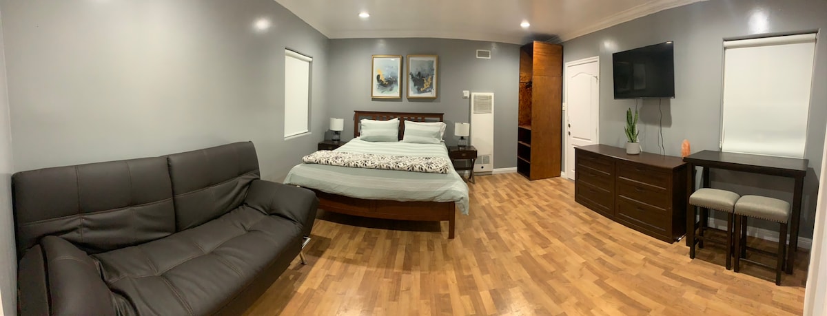 Descubre tu hogar lejos de casa en este acogedor mini estudio con baño privado y cama tamaño matrimonial. Disfruta de una entrada trasera privada, check-in automático, aire acondicionado/calefacción y estacionamiento exclusivo para huespedes. A solo 5 min del aeropuerto, Sofi Stadium y The Forum, con restaurantes cercanos y fácil acceso a autobuses. Ideal para viajeros que buscan comodidad, privacidad y conveniencia. Gay-friendly.