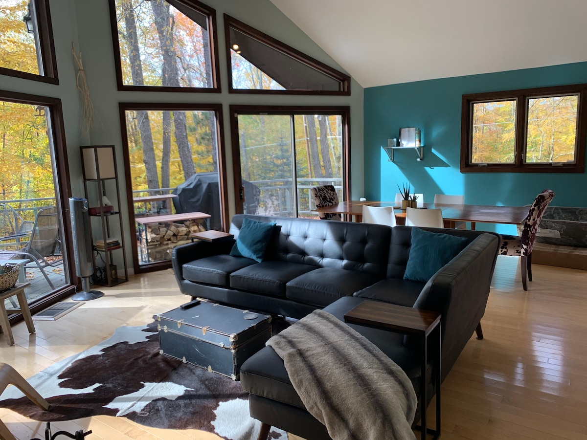 Te damos la bienvenida a las hermosas Catskills. Nuestro nuevo y hermoso chalet A-Frame está situado en 6 acres de tierra boscosa privada con hermosas vistas de la naturaleza. ¡Quédate al aire libre! ¡El chalet está completamente equipado para que lo disfrutes durante todas las estaciones! Relájate bajo el patio cubierto en todo clima (lluvia o nieve) en el JACUZZI o descansa en la sección al aire libre mientras ves NETFLIX/YOUTUBE TV todo el año en nuestro televisor AL AIRE LIBRE, juega un juego de PISCINA en nuestro loft de arriba o haz una caminata por nuestro SENDERO privado.