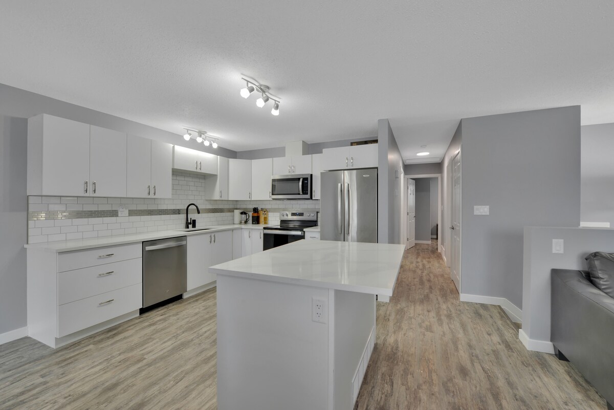 ¡Nueva sensación! Cocina de cuarzo, totalmente surtida, isla, lavandería. Amplio maestro con entrada. Televisores inteligentes en todas las habitaciones. Ducha de azulejos. Doble estacionamiento fuera de la calle. A cuadras de la avenida principal. Salón/comedor abierto. Perfecto para familias/grupos. Disfruta de un espacio luminoso y espacioso. Cocina, relájate, socializa. Ubicación conveniente. Comodidad moderna, fácil acceso. Ideal para estancias cortas/largas. ¡Un hogar lejos de casa! Para estancias más largas de 2 semanas o más, ofrecemos limpieza de “mantenimiento” una vez a la semana.