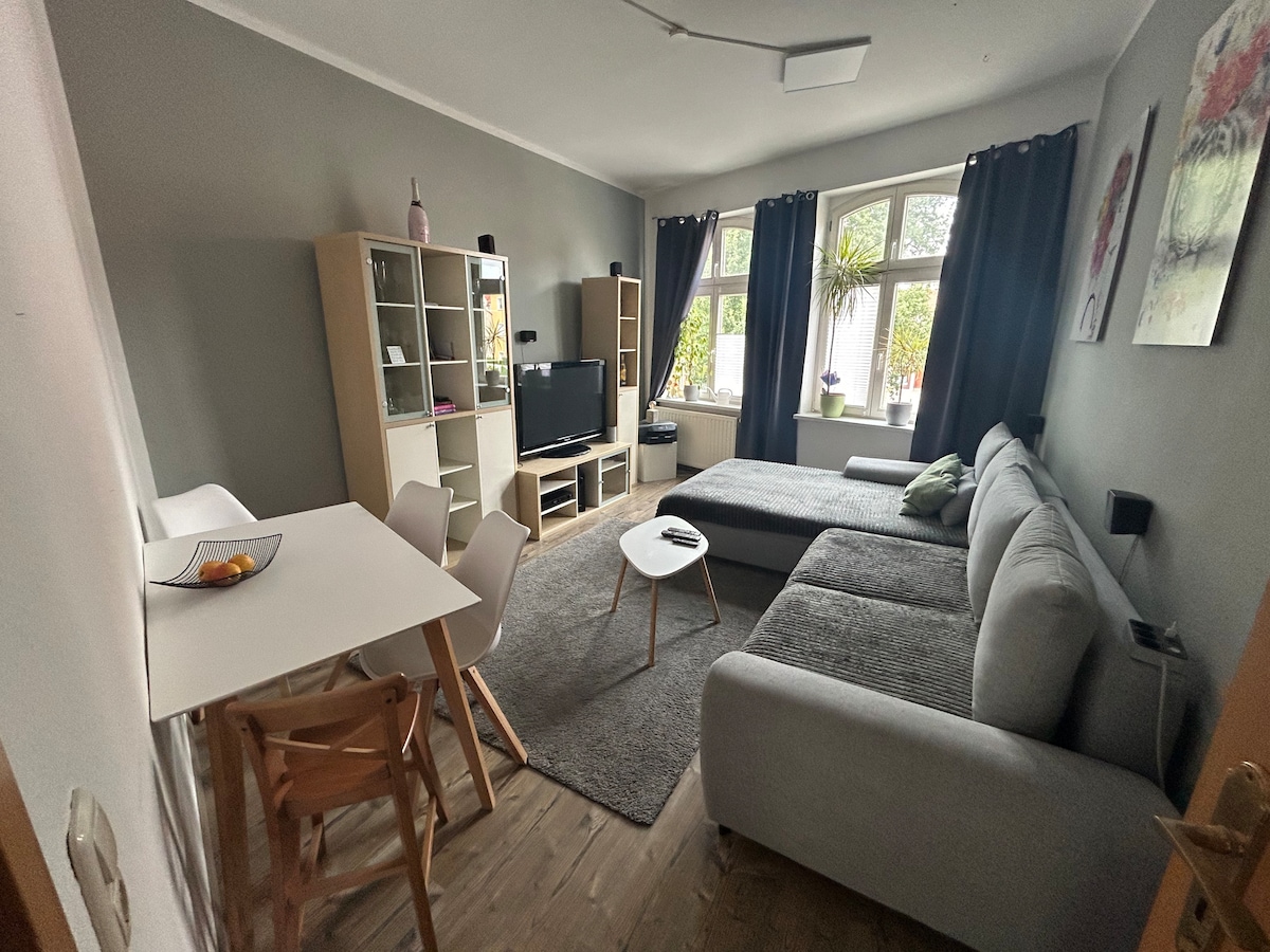 Pequeño pero agradable. Nuestro acogedor apartamento estudio de 30 metros cuadrados ofrece la posibilidad de dormir 3 personas. Aquí encontrarás todo lo que necesitas: una cocina totalmente equipada, wifi y Netflix no se aburren. Hay estacionamiento gratuito disponible justo enfrente de la puerta. El departamento está ubicado en un histórico vecindario de Magdeburgo, a 10 minutos a pie de la estación de tren de Neustadt y a 10 minutos de la universidad. El carril bici Elbe y el puerto histórico también están a la vuelta de la esquina.