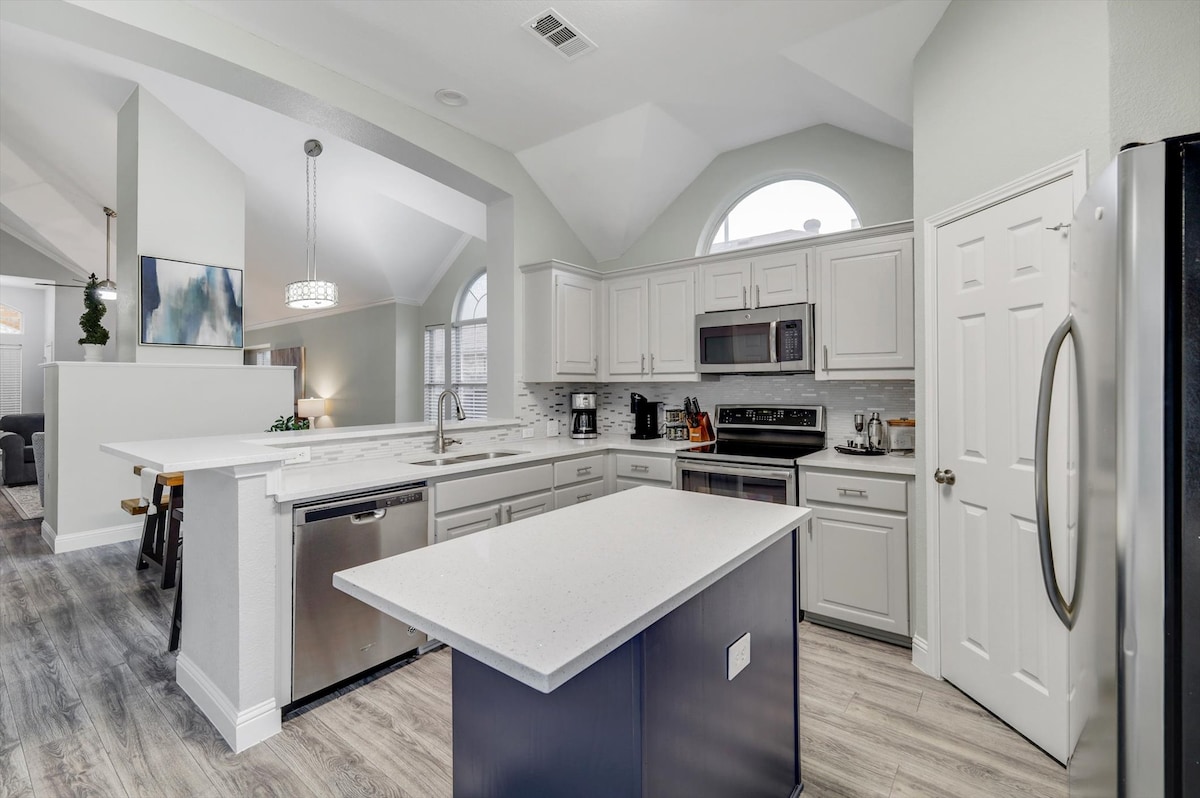 Rustic Retreat Denton es una acogedora casa de una sola planta con un patio trasero vallado que ofrece una bonita pérgola. Es un lugar excelente, ya sea que se hospede para evitar a huéspedes de renovaciones desordenadas o de eventos de alquiler a largo plazo (ALE), para visitas médicas, para profesionales de viajes o para visitar a familiares. Cocina totalmente equipada con electrodomésticos de acero inoxidable para comenzar el día. Colchón de felpa Beautyrest en el dormitorio principal; Sealy en los demás para ofrecerte un cómodo descanso nocturno; TV en cada habitación. Internet de fibra; escritorio grande. Garaje para 2 autos. Entrada larga. A 1 milla de Medical City Denton/BSW Heart/centro comercial.