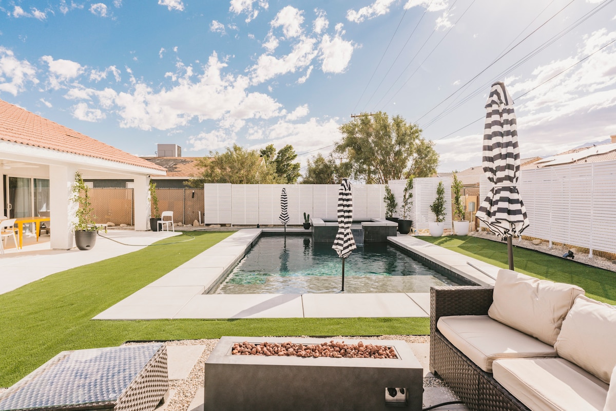 Restablece y rejuvenece en esta joya de 3 dormitorios y 2 baños con energía solar en Desert Hot Springs, California; una escapada familiar perfecta para cualquiera que visite Palm Springs (20 minutos en auto) y el valle de Coachella. ¡Es una gran escapada! Experimenta la máxima relajación y entretenimiento en tu oasis privado, con un gran patio trasero, piscina resplandeciente sin calefacción con estante de bronceado y tumbonas en la piscina, jacuzzi, putting green y chimenea. En el interior, disfruta de un tocadiscos, un enorme televisor de 75pulgadas y juegos de mesa para un entretenimiento sin fin