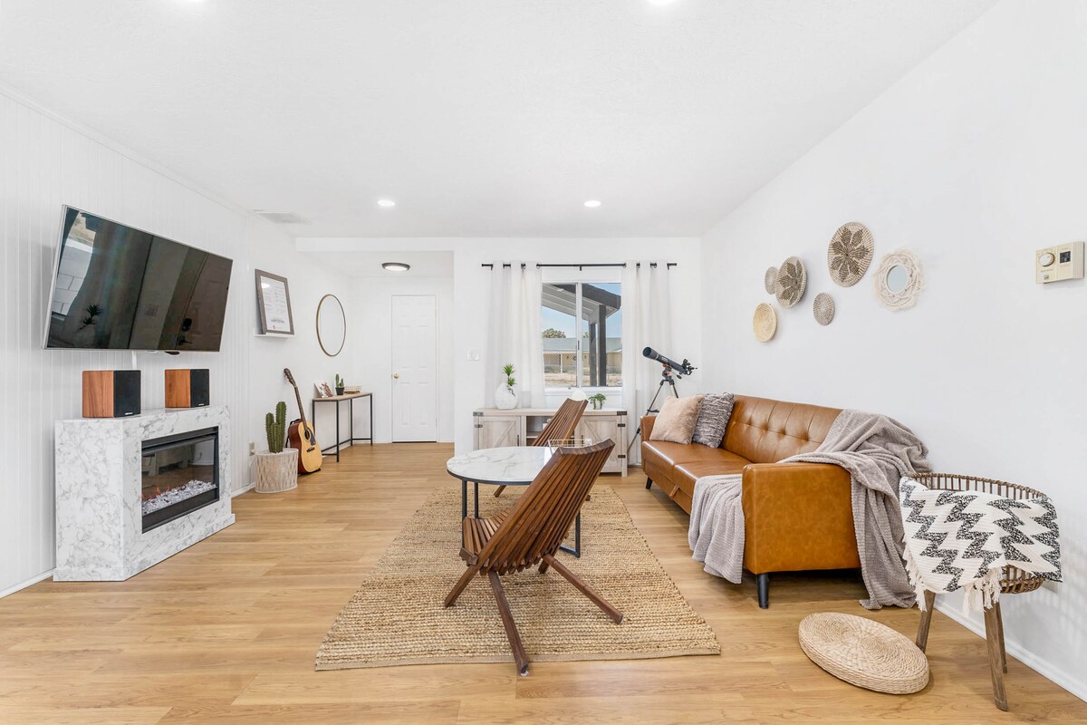 ¡Una experiencia excepcionalmente exquisita en el corazón de Joshua Tree! Hemos diseñado el espacio específicamente para los vacacionistas que visitan el alto desierto y no hemos dejado piedra sin mover. Esta villa de 2 dormitorios y 1 baño se encuentra a pocos minutos de todas las atracciones del Alto Desierto. Joshua Tree Park, Pappy & Harriets, compras y mucho más. Báñate en nuestras bañeras de hidromasaje especialmente diseñadas y dúchate con un glorioso envoltorio alrededor del patio. Columpios suspendidos, jacuzzi y estrellas como nunca antes has visto.