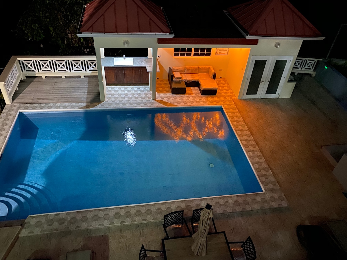 Piscina privada de lujo con calefacción solar, aire acondicionado y cocina.