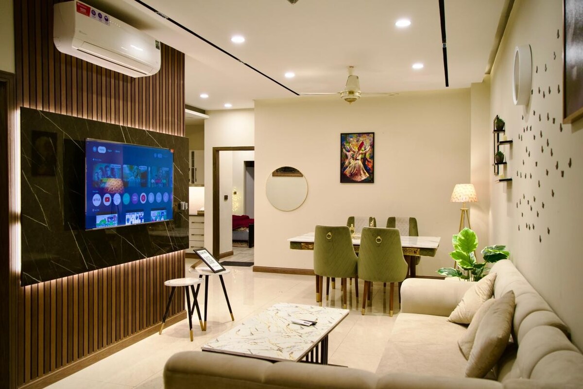 • Ubicado dentro de Zeta Mall: baja las escaleras para ir de compras, tomar un café o disfrutar de una cena (zona de restauración) sin salir del edificio. • Supercéntrico: cerca de las principales zonas, como DHA 2-6 y Bahria Town 1-8 • Totalmente amueblado con cómodas camas, una acogedora sala de estar y una televisión inteligente. • Cocina equipada: cocina tus propias comidas cuando quieras. • Wifi de alta velocidad para trabajar o entretenerse. • Entorno seguro y protegido con seguridad en el edificio las 24 horas del día, los 7 días de la semana. • Acceso a la piscina y al gimnasio