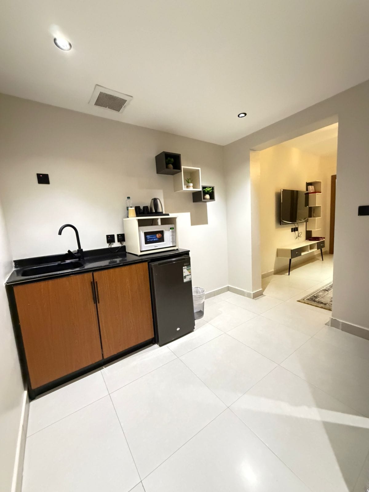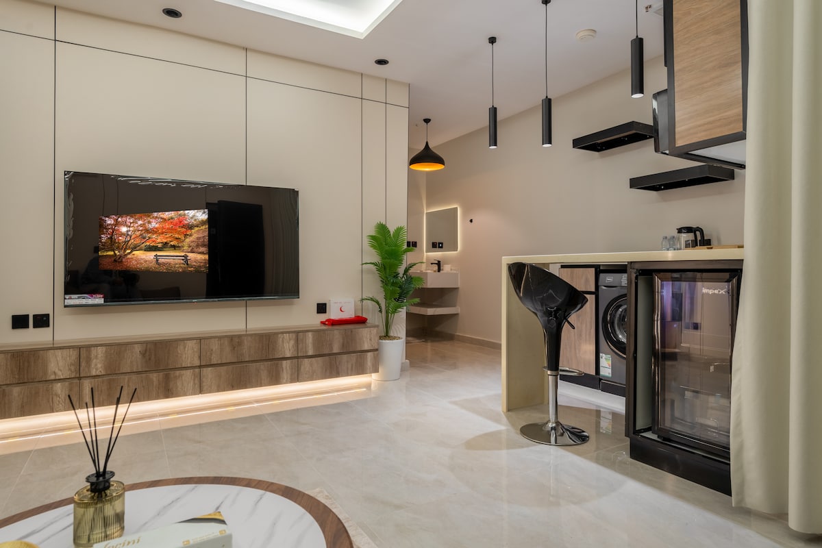 Modern 1BR in Hittin, one of Riyadh’s prime locations, minutes from Boulevard City and top cafes. Designed for comfort and ease with self check-in and a full smart system. Features a cozy living area, comfortable bedroom, 85” Smart TV, and an elegant electric fireplace for a relaxing atmosphere. Fully equipped kitchen with oven, microwave, electric stove, dishwasher, and washing machine. Clean, stylish, and ideal for couples, business travelers, and short or extended stays.